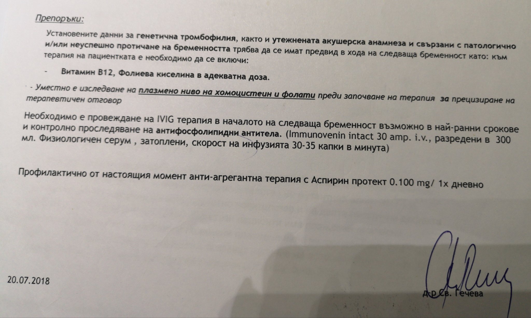 Не виждам назначени вливки в написаното от теб, но вероятно трябва да почнеш Фраксипарин или Клексан. Консултирай се с Конова и с АГ. Какви са ти нивата на Б12?