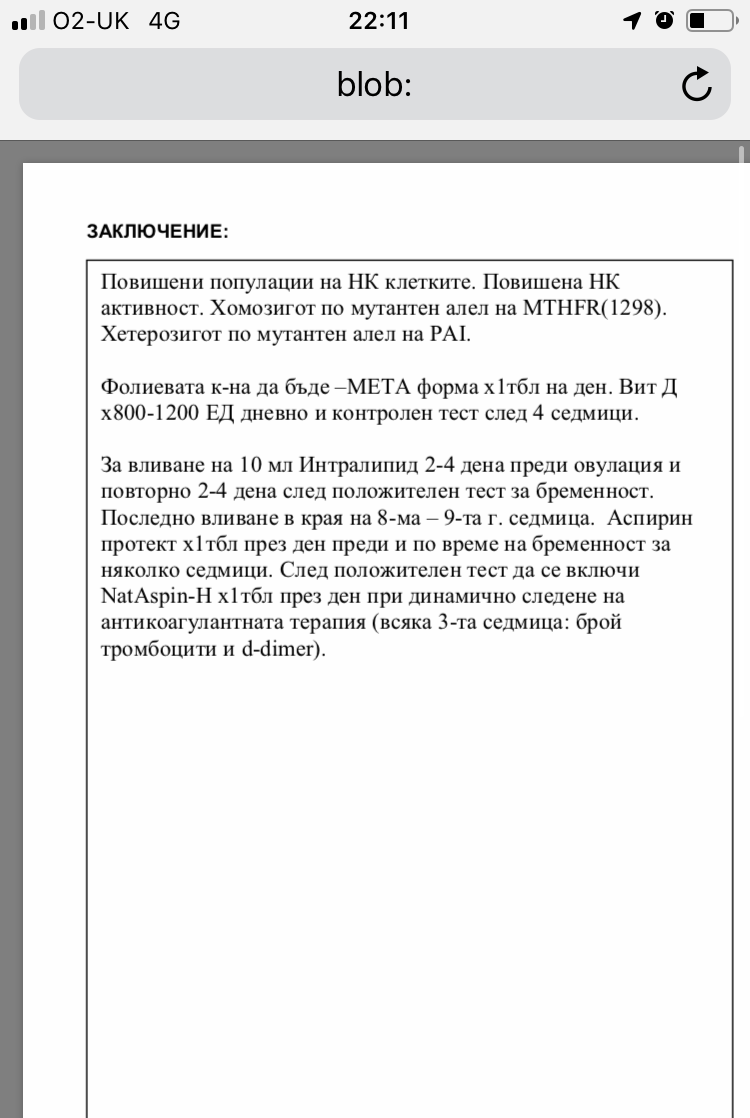 Здравейте момичета аз съм със същата диагноза от д-р Русев  и ми е малко странно . При нас като цяло имаше открита уреаплазма за което се смята че е причина за лошата морфология при мъжът ми (която е 2%) за момента вече сме чисти и двамата от нея . Прибрах се до Бг (тъй като живея на вън ) с идеята да направим тези вливки и да пробваме дали ще стане естествено ,но проф. Тимева което ни води случая каза ,че без да види подобрена морфология на мъжът ми няма да МО влива нищо . Също така каза че това завишение при мен на НК клетки е възможно да е в резултат от уреаплазмата (когато ги пускат не знаехме че имам и аз уреаплазма ) . Сега дилемата е дали да чакаме 3 месеца и да видим дали морфологията ще се подобри или направо да си действаме за ИКСИ ,като преди трансфер ще ми пусне пак НК клетки и ако имам нужда все още тогава ще ми правят вливки на интрапилид , за аспирина каза че щв го пия и него тогава . Та сега го умоваме защото вече много време чакаме а бебе няма . До сега не съм имала бремнности и направо нз какво се случва Sad
