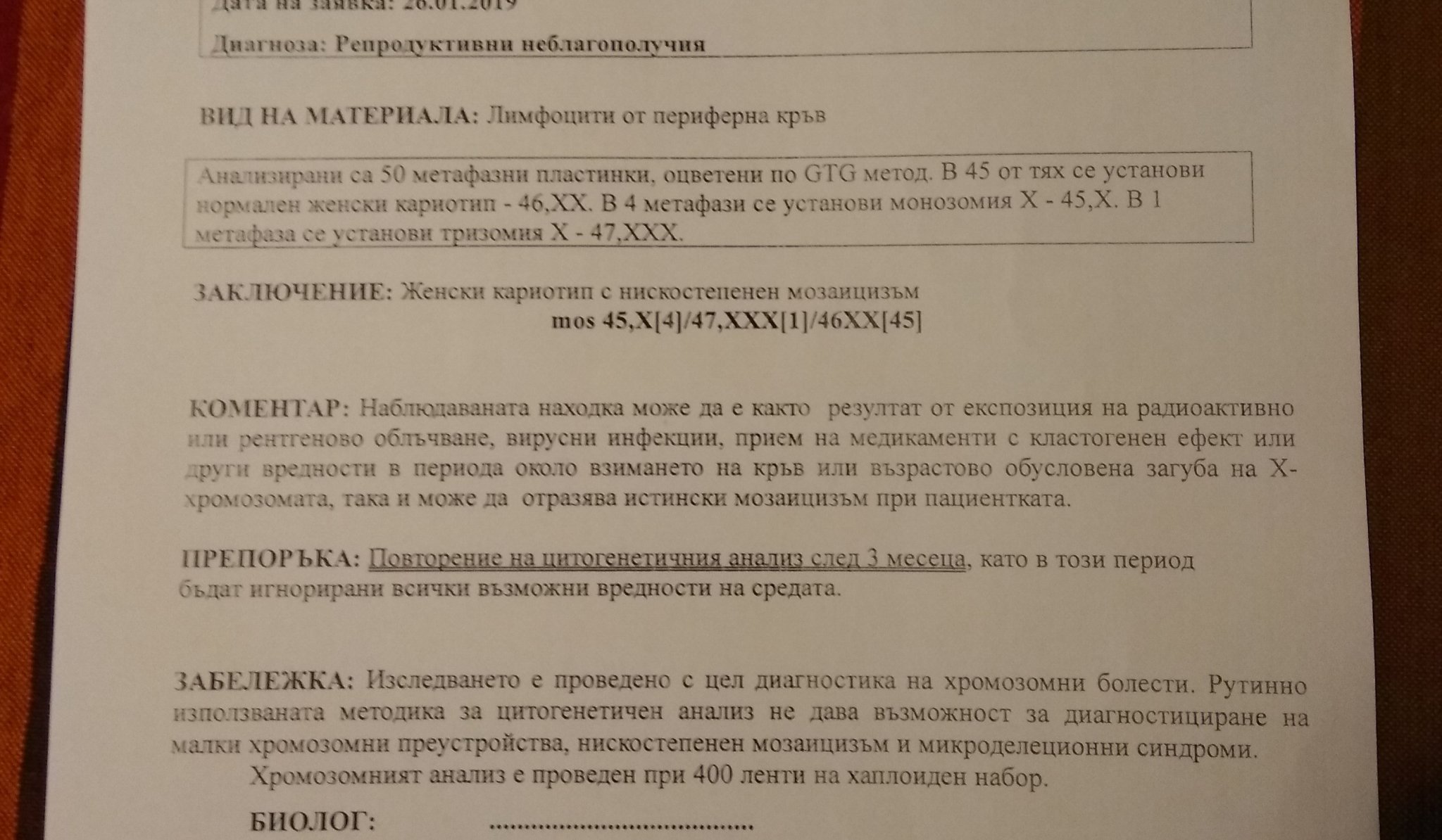 Здравейте скъпи дами. Колежките от мъжки фактор ме препратиха към вас и имам едно питане с молба .На 28.03 ще трябва със съпругата ми да ходим до ЦАР да си вземем заповедта и да я занесем в надежда. Предварително си направихме изследванията за бактерии, чисти сме,  пия каквото трябва,пък да видим . Накараха ни да си направим и кариотип, скъпичко, но пак незнам доколко беше наложително, ама айде, на хорото сме и скачаме според тоягата.  Знам че опита на всички ви е много богат, моля ви да ми разчетете 2те изследвания за кариотип на двамата, да съм наясно за какво иде реч преди да идем при лекаря.  Много по-спокойно би ми било ако се ориентирам предварително какви са хромозомните ни проблеми, ако има такива преди посещението.Благодаря ви предварително за отзивчивостта .