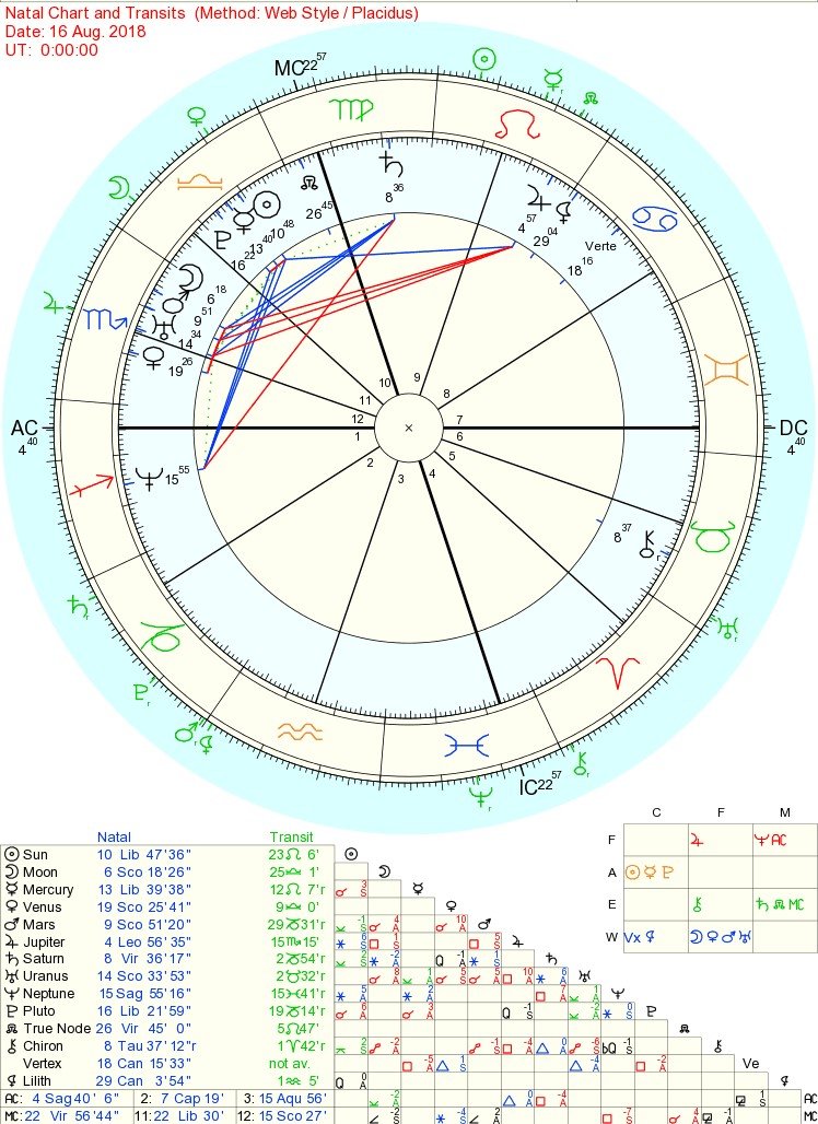 Здравейте. От известно време усещам едно завръщане на интереса ми към астрологията( който започна преди около 18 години и тотално замря преди около 8-10) и се зачетох в тази част на форума. Всички сте много добре подготвени и информирани, а моите познания са съвсем повърхности. Би ми било много приятно, ако някой от вас хвърли поглед на картата и транзитите ми.