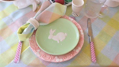 Мен тази година ме влекат пастелните цветове, избива ме на розово, светло синьо и млечно зелено, а украсата у дома е предимно в бяло. В тези цветове исках да бъде  масата за Великден. Пкривката я имам отдавна, но я пазех за този специален повод.