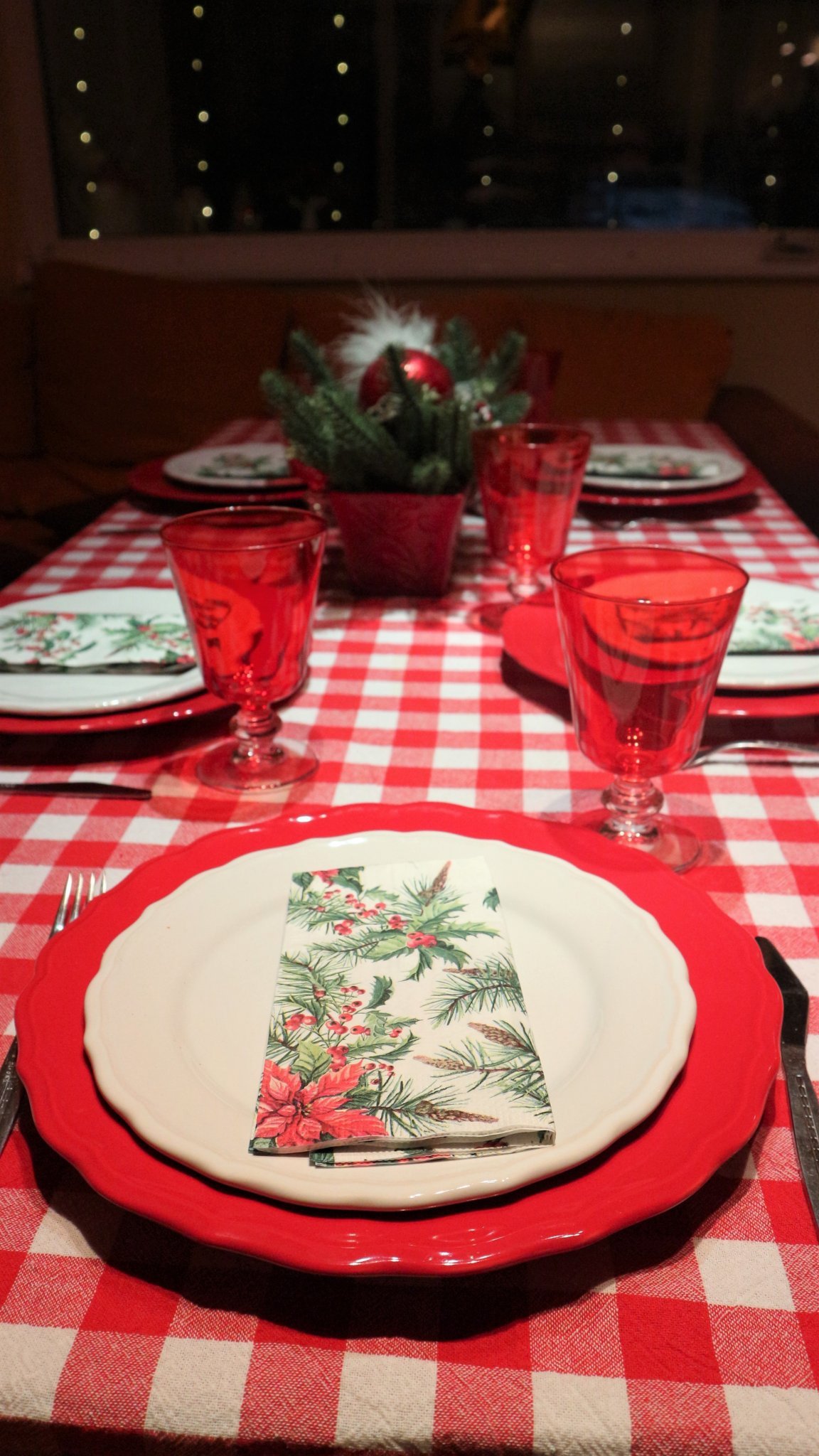 Комбинацията със златистите рингове за салфетки също ми допада. С червения цвят ми идват малко повечко цветовете, но това си е чист въпрос на вкус, иначе си го съчетала и много добре повторила. И формата на чашите много ми харесва, тези за вода. 😃