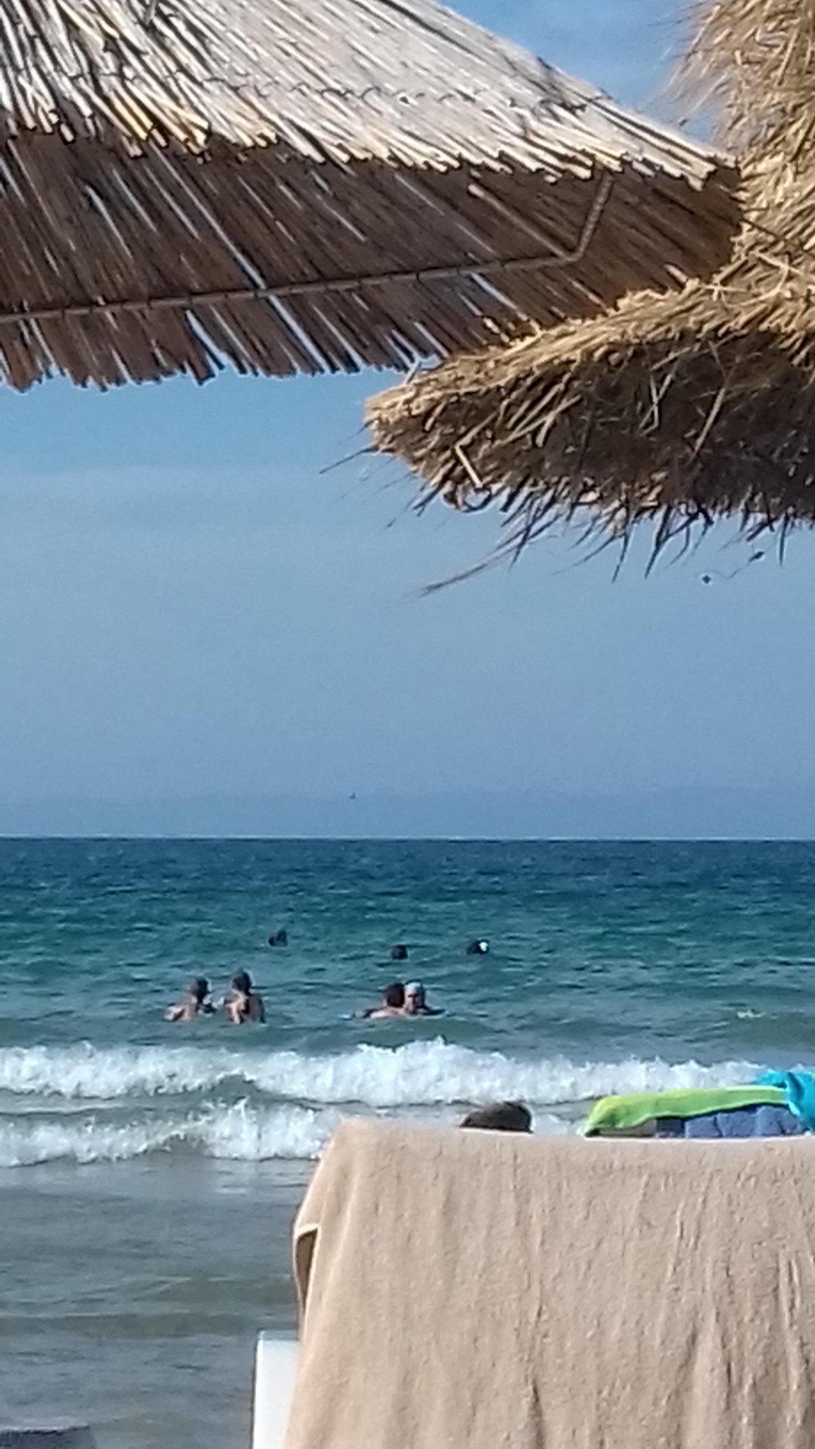 А тук: Шезлонги, чадъри, хавлии+бар с напитки на плажа.