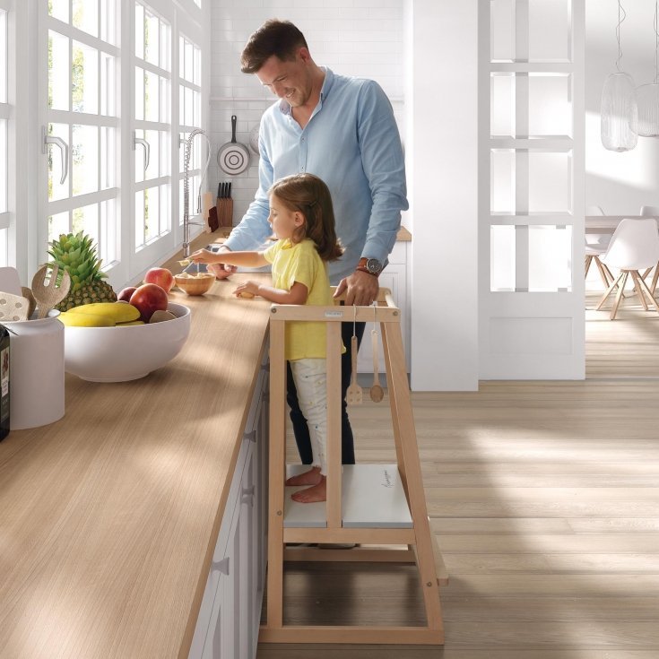 Много хора си правят такава learning tower от една стълбичка от Икеа, върху която правят парапет от летвички или някое обърнато дървено столче пак от икеа. Стълбичката ние я имаме, 30лв е.