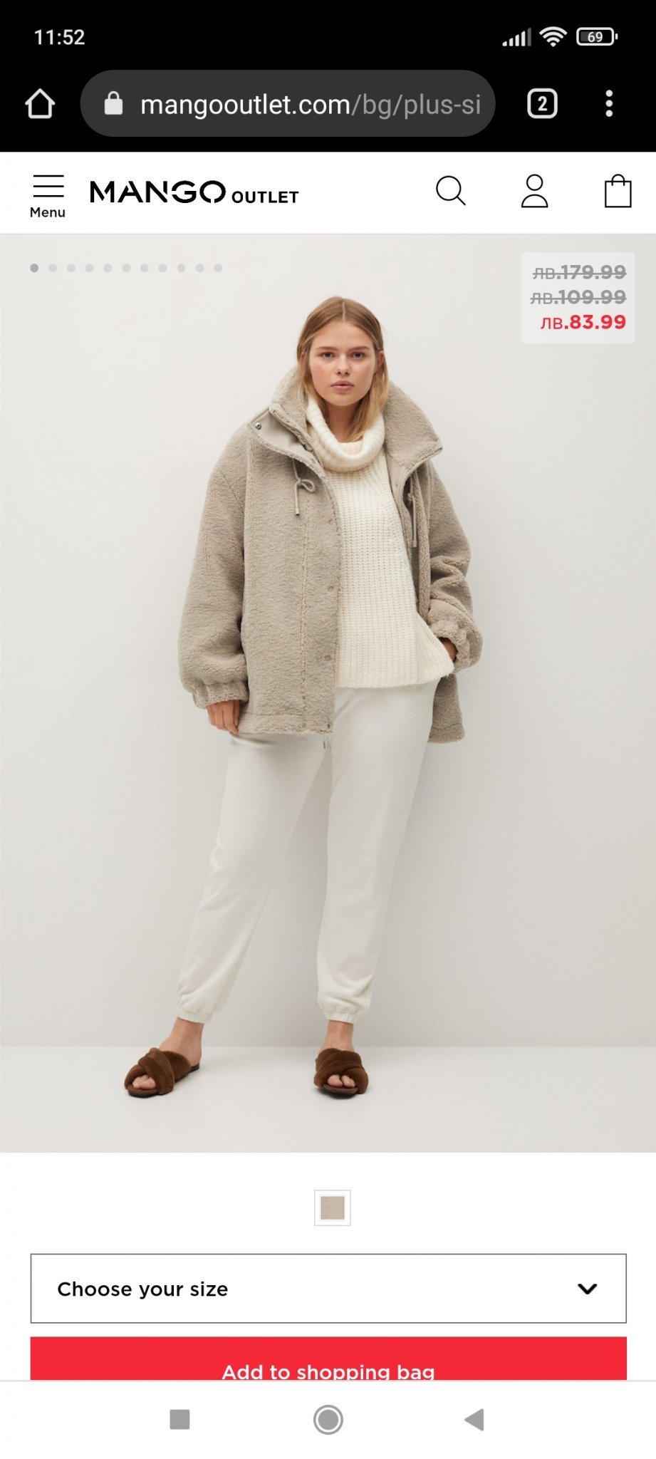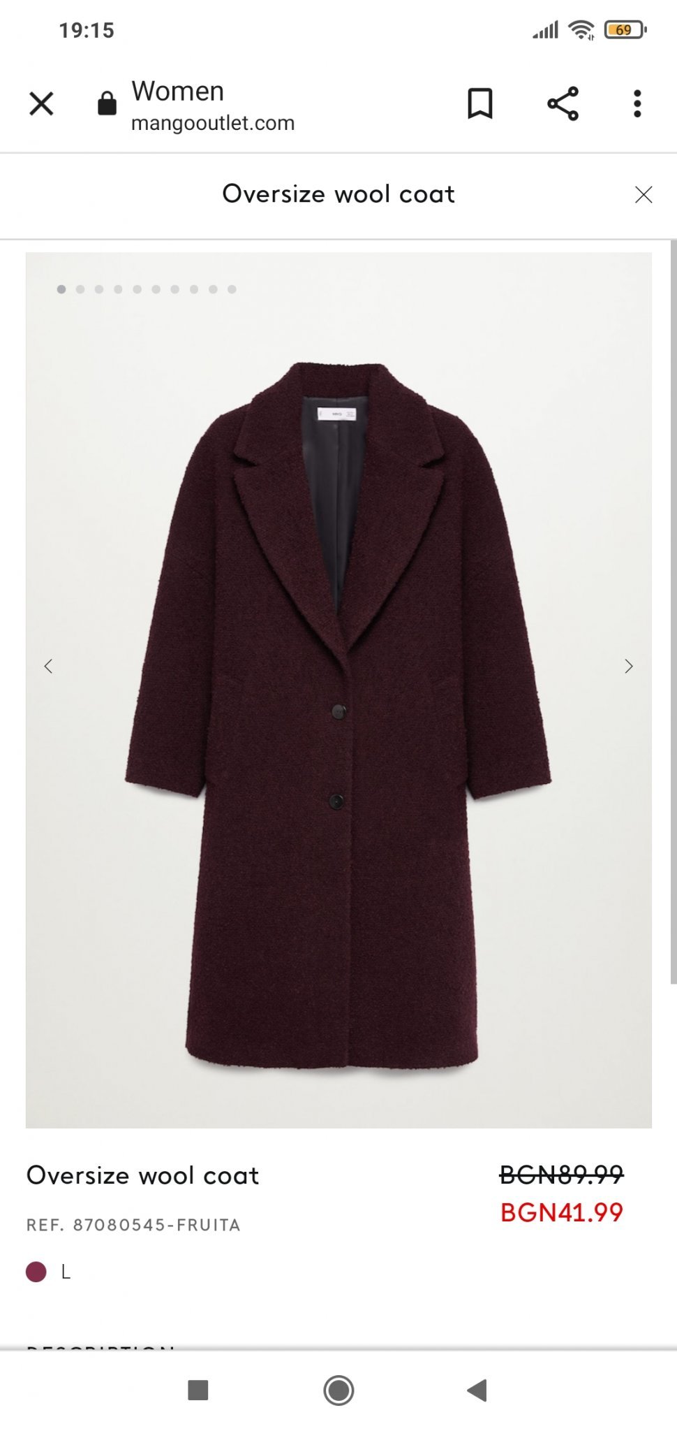 Това палто е размер Л, но ми е голямо. С 50% вълна е, не е дебело. Хубаво е, но не уцелих.