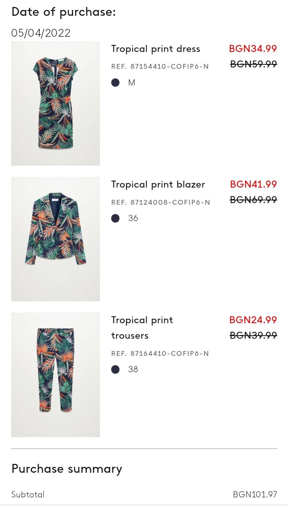 Включвам се и аз с тропическата серия.Първо поръчах Л от роклята.По принцип съм М,но коментираха че подобни рокли са умалени.Л ми беше голяма. Тъй като много ми хареса роклята поръчах М.Вчера и тя дойде. Тя пък ми е малка!!!Между двата номера има доста голяма разлика. Поне 2 пръста и половина. Отделно ,че съм с широки рамене и там много опъва.И сега се оказах с 2 рокли,от които нито едната не мога да нося.Реших ,че ще опитам да стесня голямата при шивачка.Така ,че момичета и аз предлагам М размер. 25 лв.