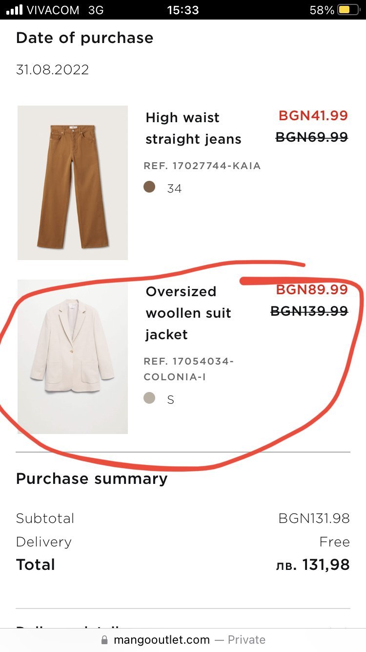 Здравейте, попаднах случайно тук търсейки информация как мога да върна нещо закупено от аутлета. Разбирам че разменяте или продавате в тази тема. Аз поръчах сако и дънки,  но сакото се оказа голямо за мен. Размер С е, но е уголемено. Бих искала да го продам или разменя за същото но ХС. Цена 70 лв. https://www.mangooutlet.com/bg/women/jackets-and-overshirts/over … 7054034.html?c=08
