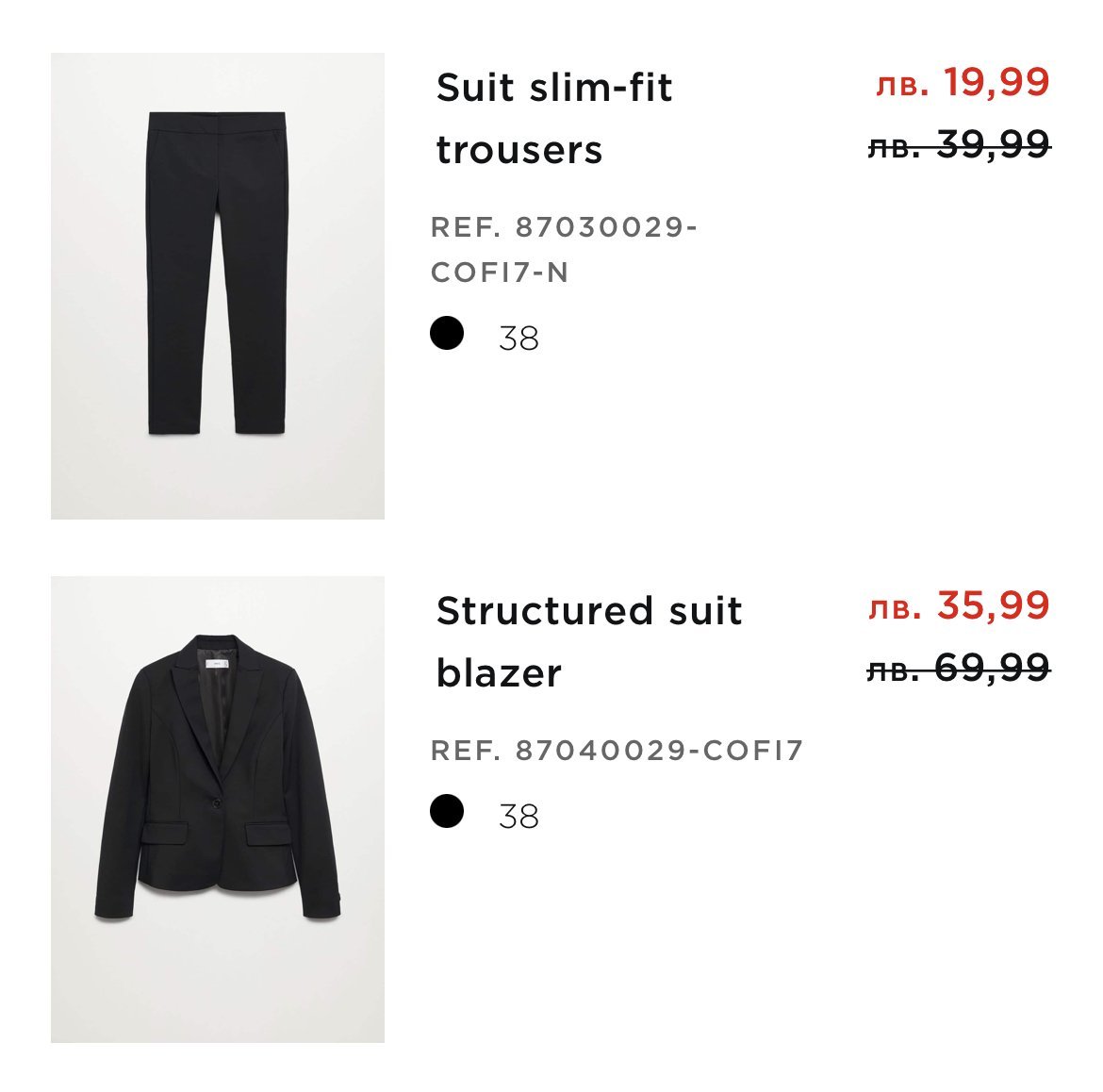 Разделям се със сако и панталон, размер 38. Отговарят си.