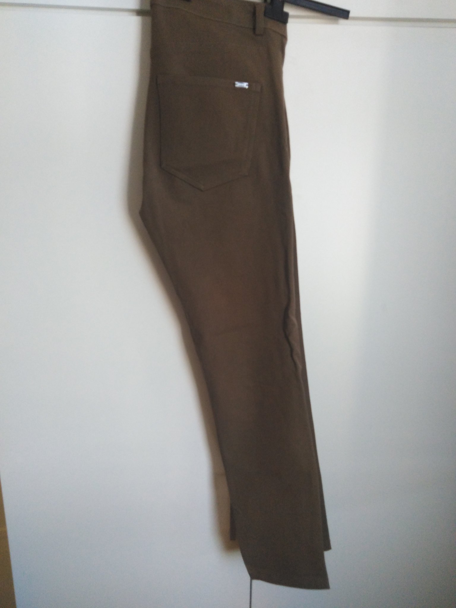 Размер 36, талия 74 см, дължина 93 см, ханш 92 см. Прав модел, има еластичност. Цветът е войнишко зелено, не мога да го уловя на снимките. Състав - вискоза, памук и еластин.