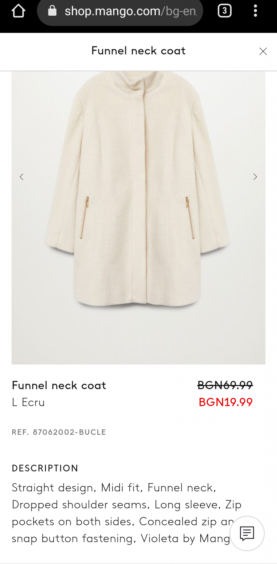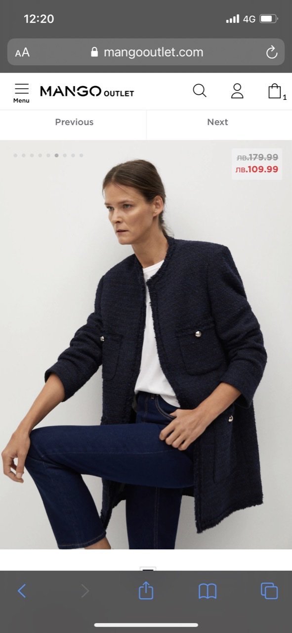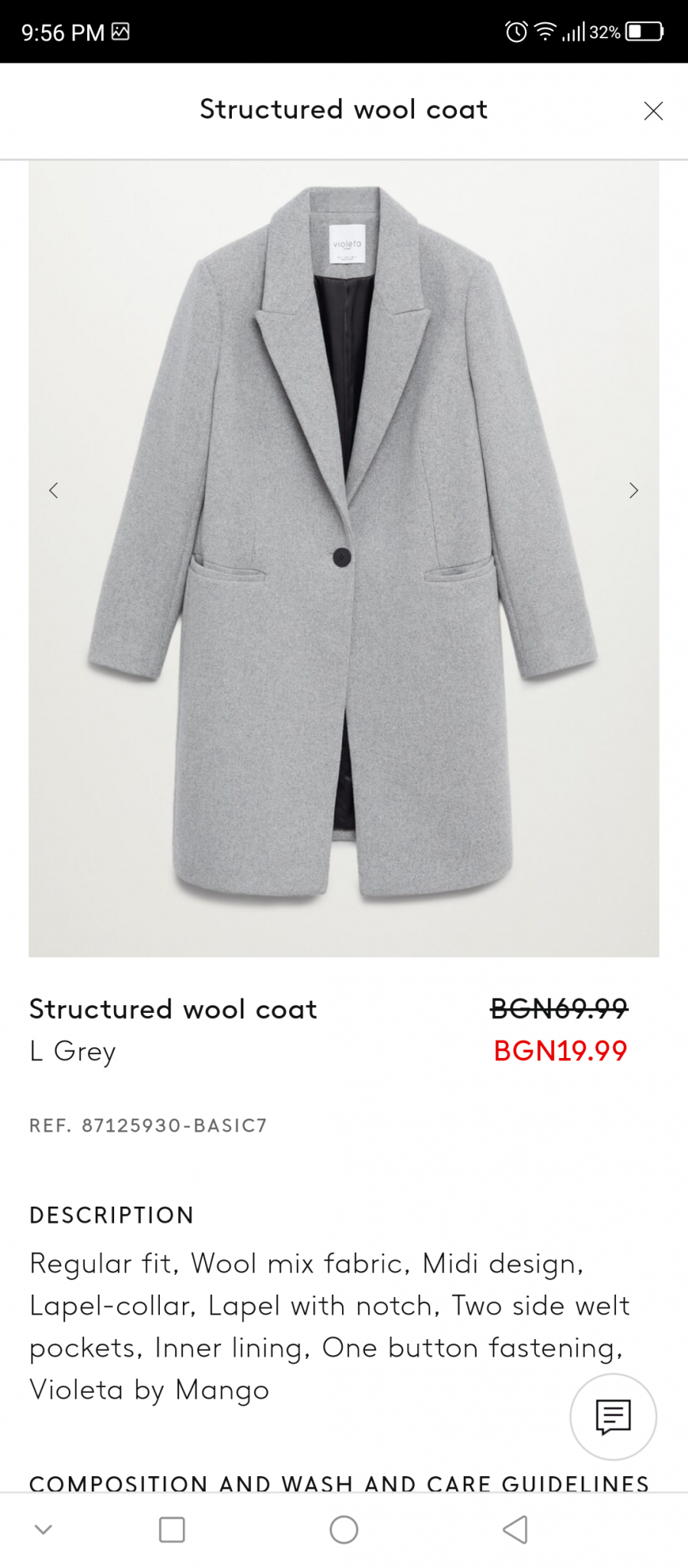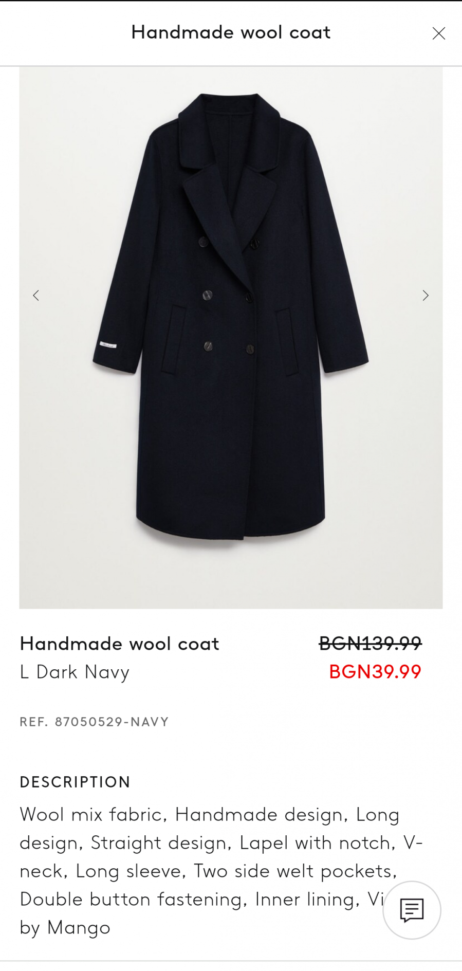 Здравейте, това палто/блейзър от туид(букле) си търси нова собственичка. Днес пристигна. По етикет е С р-р, но според мен отговаря на М. Купено за 110 лв. Продава се за 80 лв https://www.mangooutlet.com/bg/women/coats/tweed-coat_77068261.html?c=69&n=1