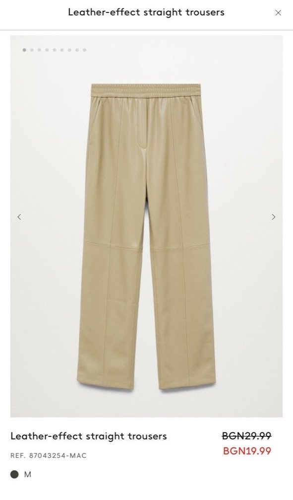 Панталон М, но на мен ми идва свободен. За сравнение дънки 38 са ми точно. Много мека и приятна кожа, прекрасна имитация. https://www.mangooutlet.com/bg/women/trousers/leather-effect-str … &busqref=true
