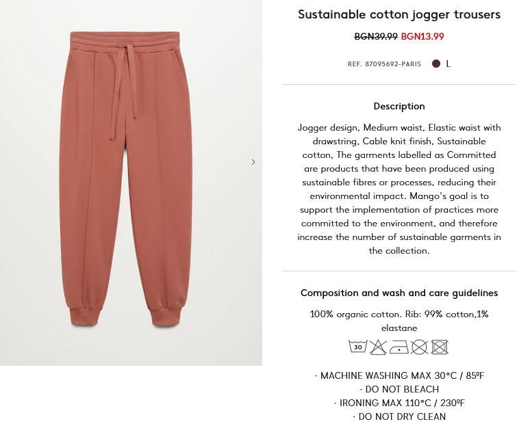 Получих и аз днес това първото долнище от поста показан над мен. Цветът е керемидено, тип сиена. Аз поръчах размер С и ми пасна точно. Иначе съм между С и М. Ако на някой ми помогне за ориентир. Качеството на спортните неща на Манго, по начало за без компромисни! Ако беше мой размер- С го взимам веднага!