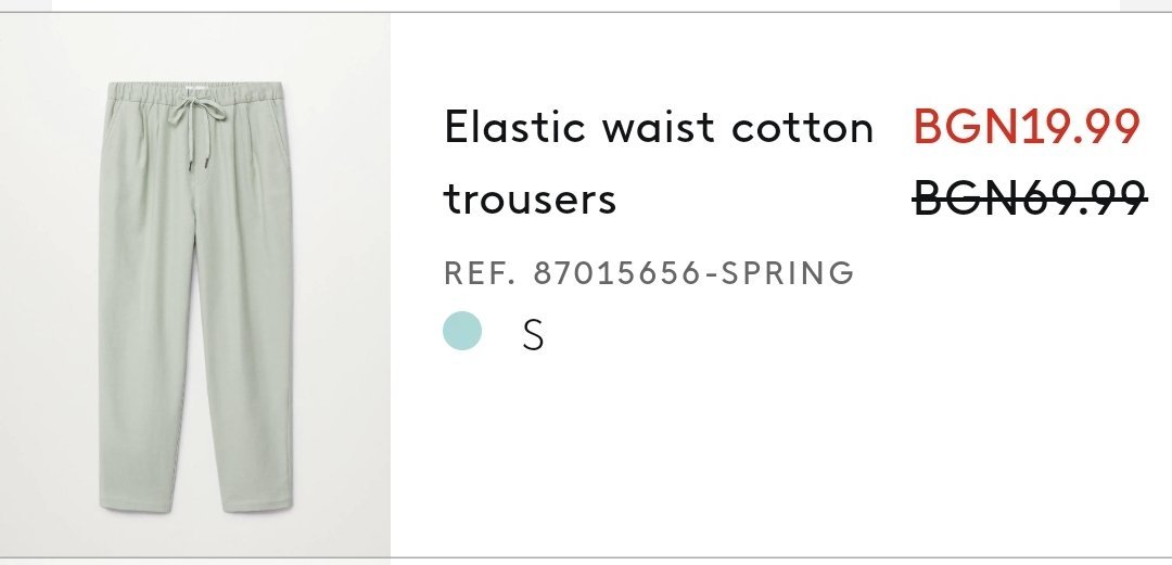 https://www.mangooutlet.com/bg/women/trousers/cotton-pleated-tro … html?c=37&n=1  34 размер/ цвят  Khaki не се харесах с тях. За по-високи дами са. И размерът е уголемен според мен и отг на 38.