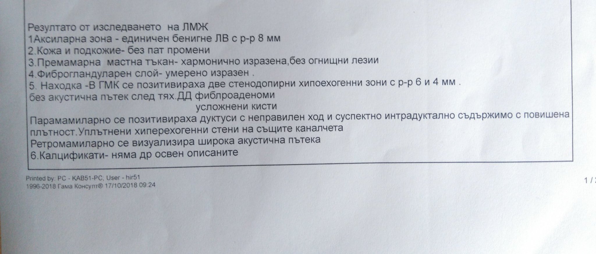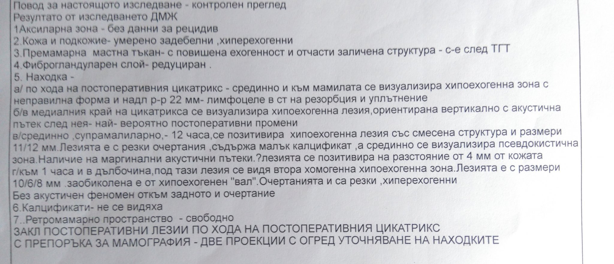 Откри находки и в двете гърди. Самата тя видя в досието, че съм си ги имала и преди, но нещо я притесни. Или повечко са станали, или е чудно защо химията не ги е унищожила, или... не знам и аз какво... не ми допадна реакцията обаче и на хирурга при когото се върнах с тези резултати, както и на личния, при когото трябваше да отида за направление, че не било ли в деня за диспансерно наблюдение, както при мен се случи да не мога да мина мамография и трябва или направление, или да си платиш...