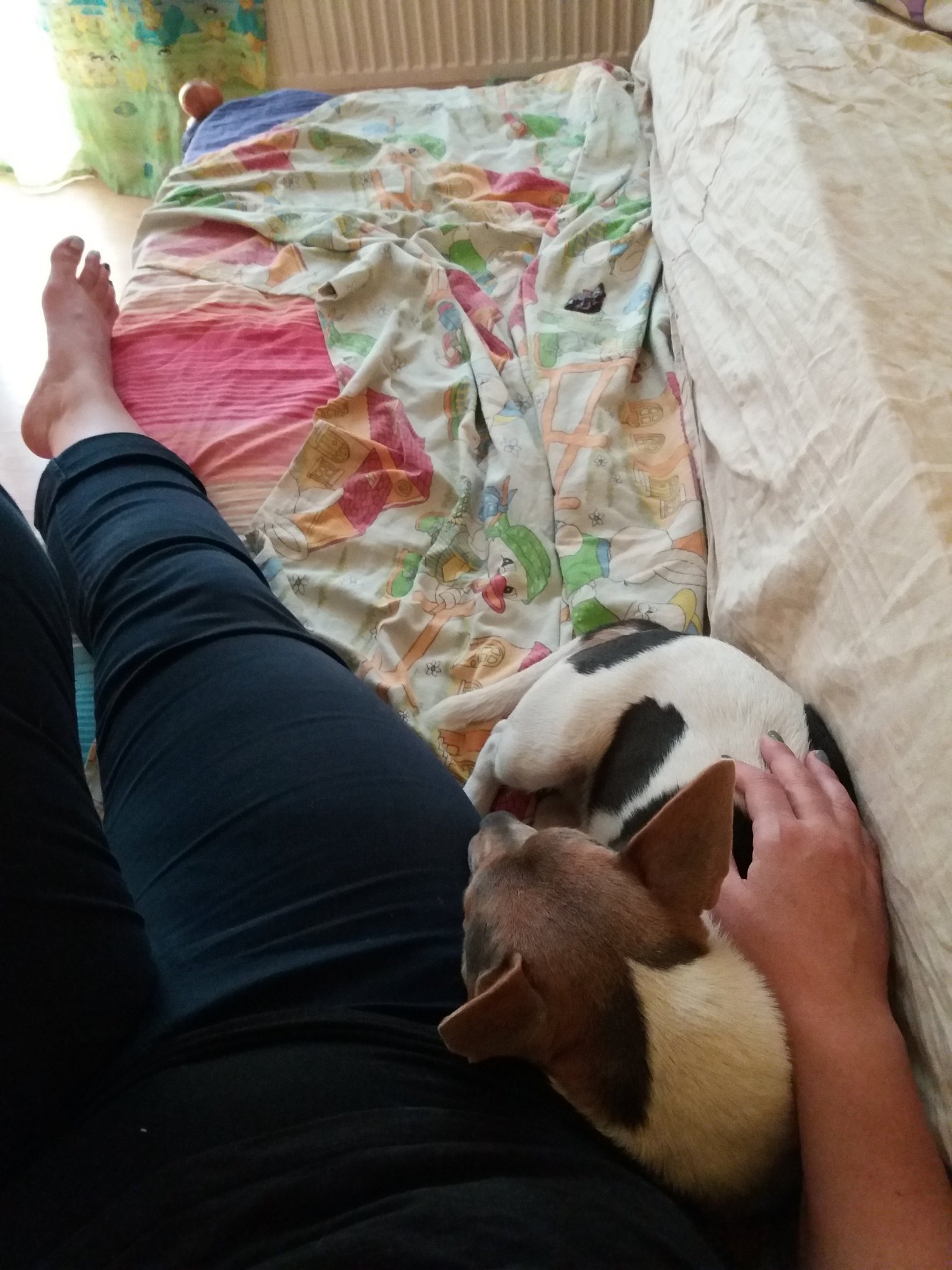 Оставих я да спи на дивана и отидох на работа, като се върнах се беше затъжила за мен и  вече беше забравила, че е сърдита и нещастна и се опитваше да ми се метне на ушите от място.