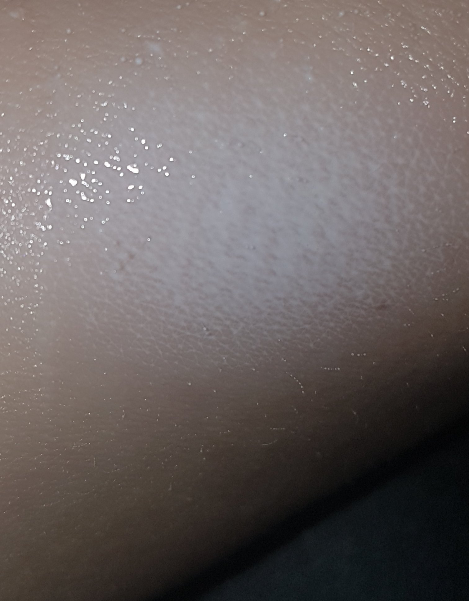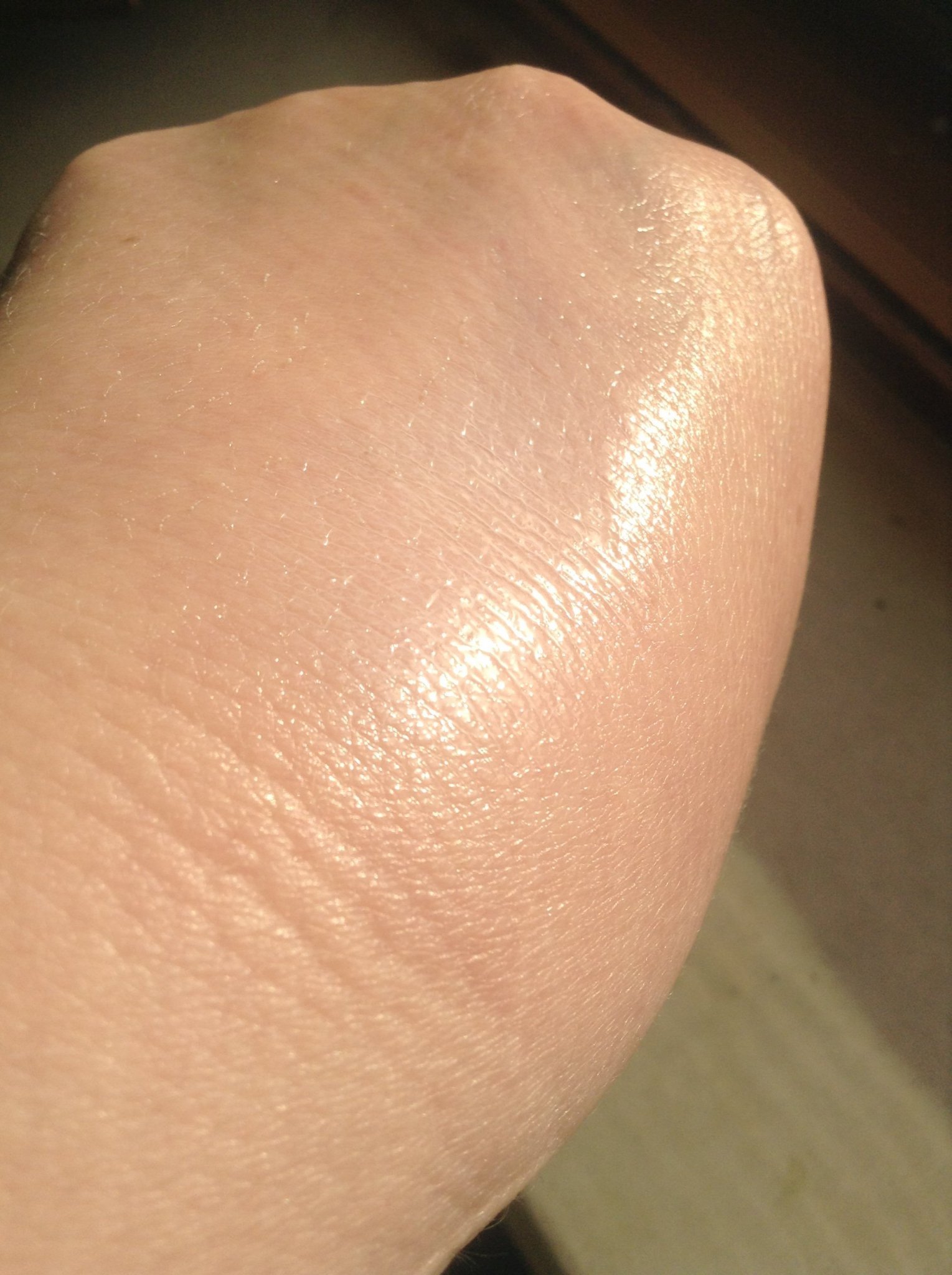 Ето и при мен как стои, пръснат току-що. В началото има мигновен блясък, после за секунди повърхността се матира. Върху грим е чудесен този продукт. Аз пръскам обилно, нямам забележки!