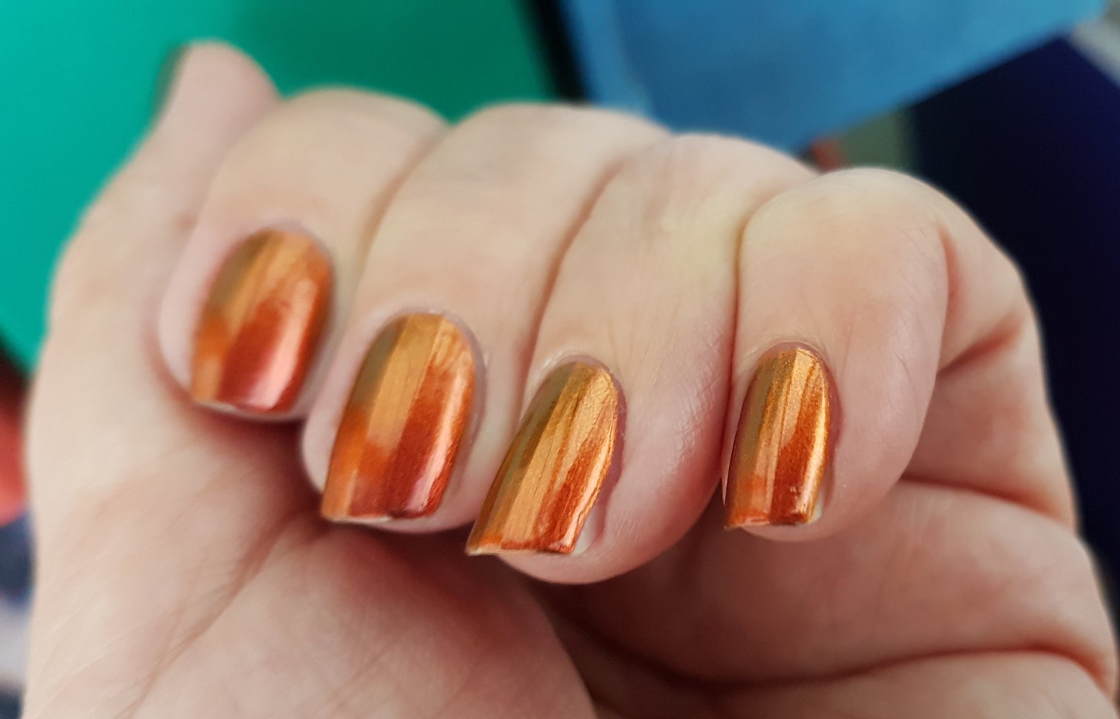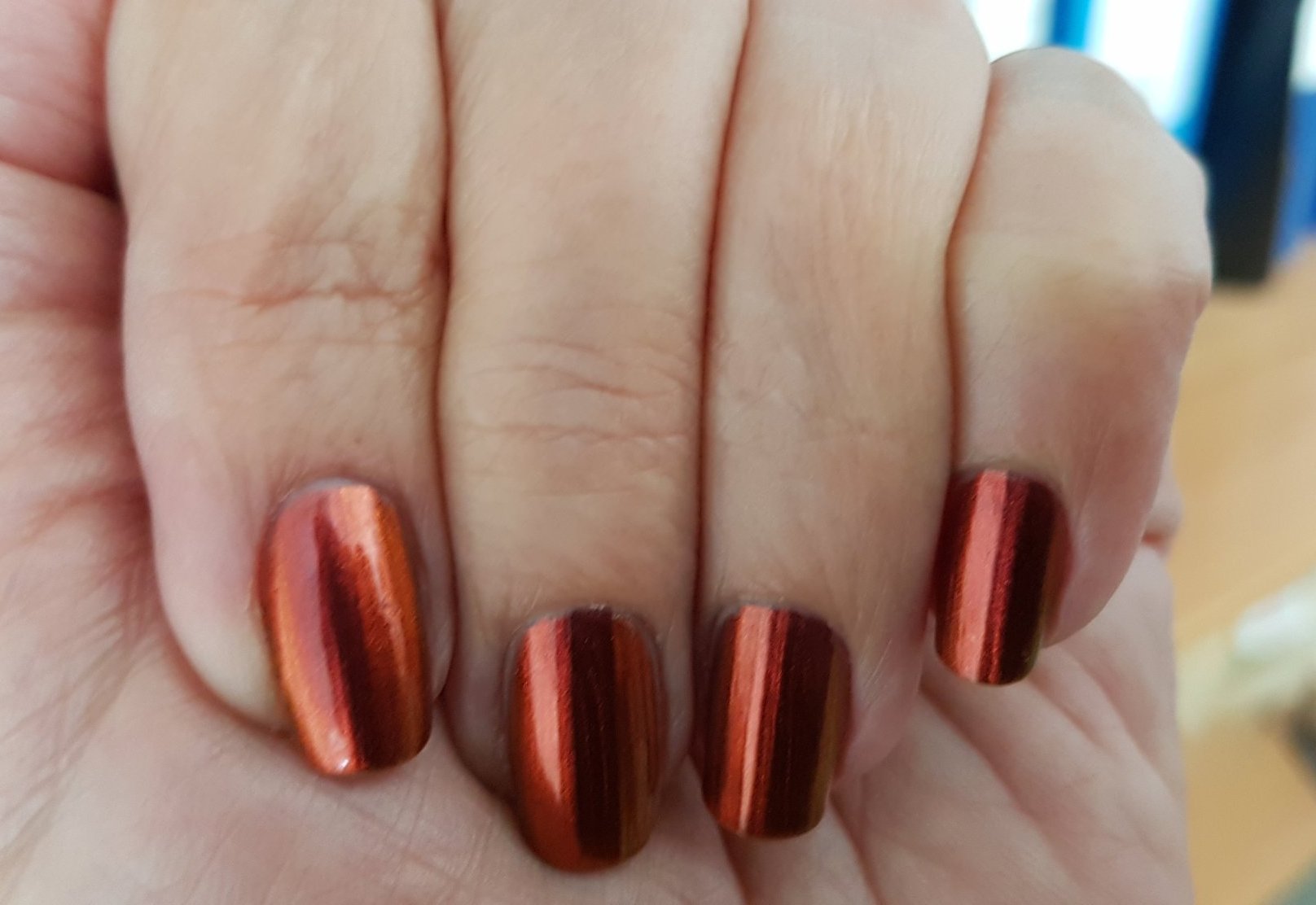 Агент, отгоре е с топ лак, та нЕма да стане. Не мога да спра да си зяпам ноктите. Ама точно зяпам, не ги гледам Simple Smile Веднъж е с цвят на мед (разбирай метал), веднъж е зеленикъв, веднъж е оранжев, веднъж избива жълто или тъмно червено даже. Няма хващане на снимка. Прилича точно на есенна гора с всичките й цветове.