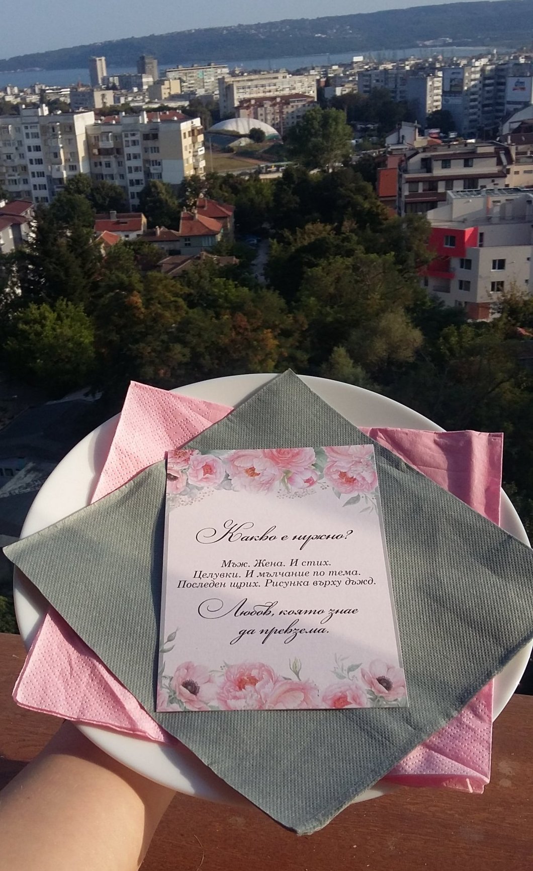 Нашите подаръчета бяха тези малки книжки от Дар птица, които са с цитати за любовта. Мисля че друмче имаше такива, но с техни снимки и други цитати. Нашите си бяха стандартните, които предлагат. Раздавахме ги на гостите, когато минавахме за наздравица. Давах по 1 на семейство и по 1 на необвързаните. На децата подарихме детски книжки и вътре бях написала "Мило дете, пожелаваме ти приказен живот, изпълнен с много вълшебства!". Simple Smile Също така на всеки на мястото бях направи тейбъл картичка с име и фамилия и със същия фон едни картички, на които пишеше "Благодарим ви, че станахте част от нашата приказка! Вие направихте празника ни незабравим!". Аз си мислех, че на хората ще им харесат и ще си ги вземат за спомен, много се постарах да ги направя и да ги нося за печат, да избирам картон, на който да се разпечатат, да разпределям всичко по маси, бях луднала, но в края на вечерта видях, че са останали много такива картончета по масите, малко хора си ги бяха взели.