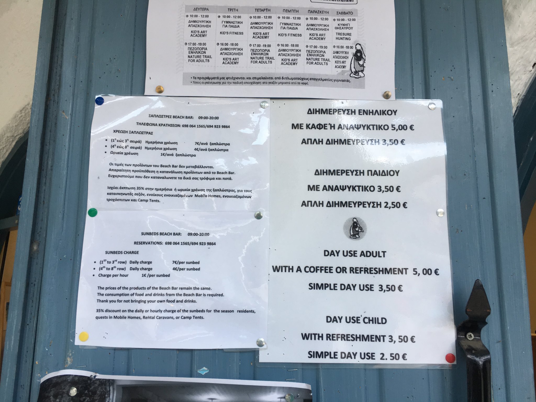 - дневно ползване на плажа (за НЕ гостуващи на къмпинга като нас)  е 5Е за възрастен, което включва само напитки, но не и шезлонг: кафета, фарепта, бири... деца до 12г са безплатно