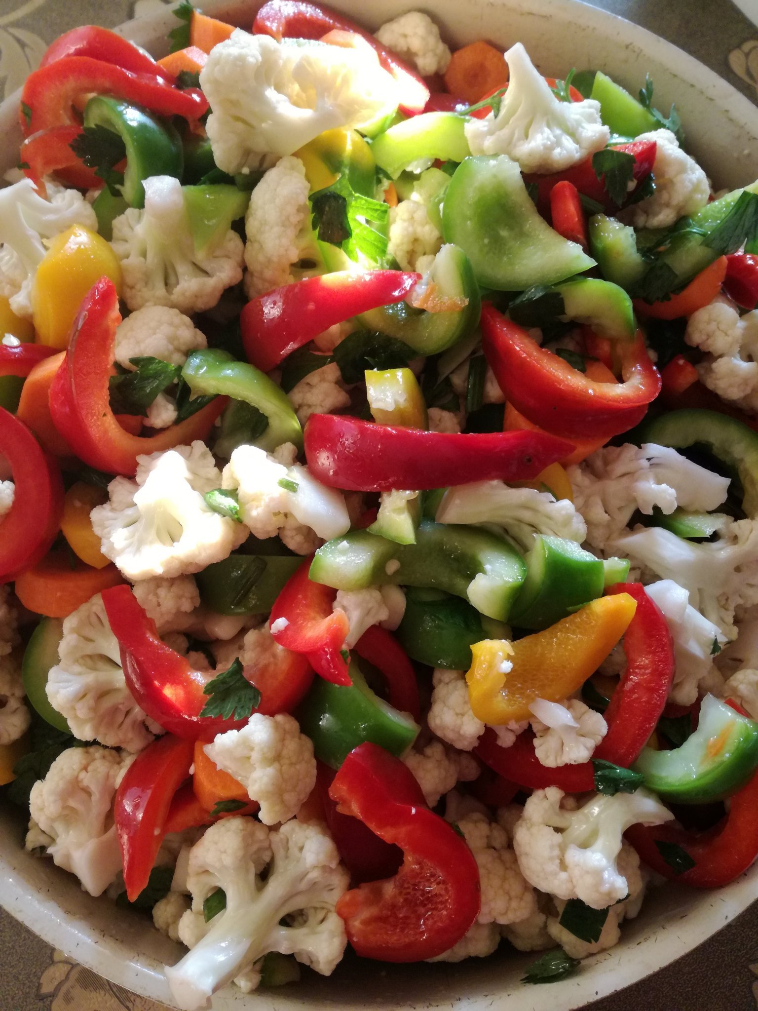 Сложих на око карфиол, камби, морков, чесън и целина. На около 2,5 кг зеленчуци ръснах 4 сл сол, 6 сл захар, около 1/2 чаша оцет, 1/4 чаша олио. Ама бърках и на вкус го докарвах. В 3 кутии от сладолед е сега в хладилника, за сегашна консумация. Ако искате за зимата ще ви напиша точни пропорции