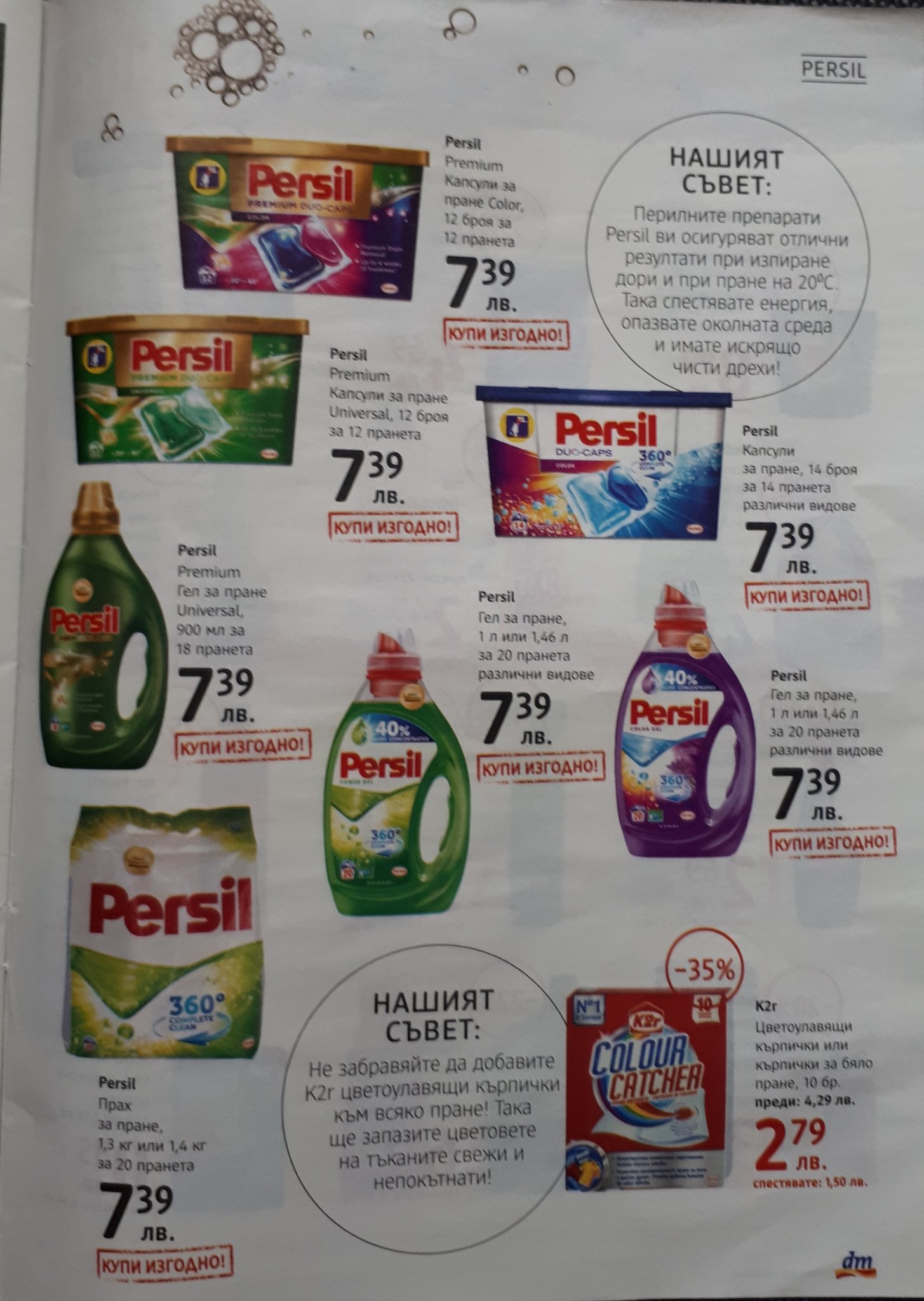 Синът ми каза, че Персил в Кауфланд за 60 пранета е само за бяло и за цветно – прах и гел. Няма сензитив. Всичко пристига на палети ежедневно и каквото е на палета, това зареждат, затова понякога има само за бяло, понякога – само за цветно, ако търсенето и потокът е голям. Ако има някакви остатъчни количества в склада, зареждат тях и има от двата вида. Това е като информация отвътре.