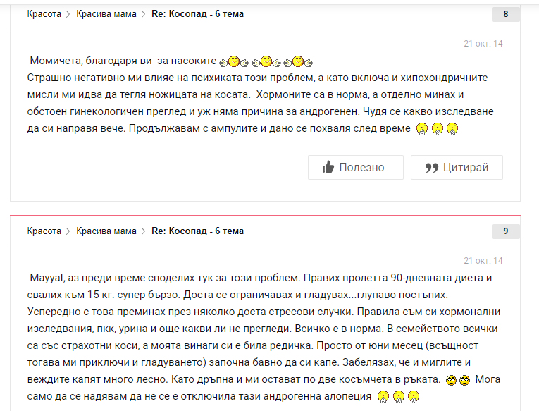 Положението не е добре, образува ми се нещо като петно с оредяваща към изчезваща коса, на площ от 2-3 см буквално мога да си преброя космите, нови растежи няма. Останалата част също оредява, но все пак изглежда прилично. Много съм притеснена, има нощи в които не мога да спя от ужас, че ще изгубя косата си. Относно наследствеността, нямам хора с проблеми в рода си, всички са с гъста или не толкова коса, но не са имали косопад никога.