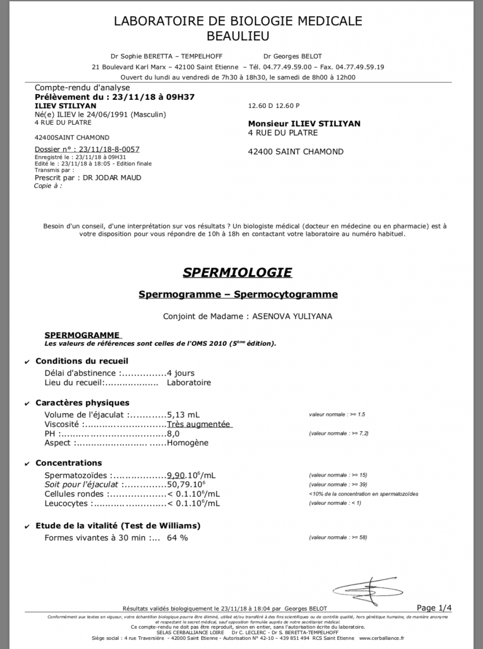 здравейте ,от 4 г пробваме да си имаме бебе но месе получава и решихме да ходим на доктор в франция мойте следвания са ок а на мъжа ми не са казали още може ли да ми кажете спермограмата на моя мъж как е