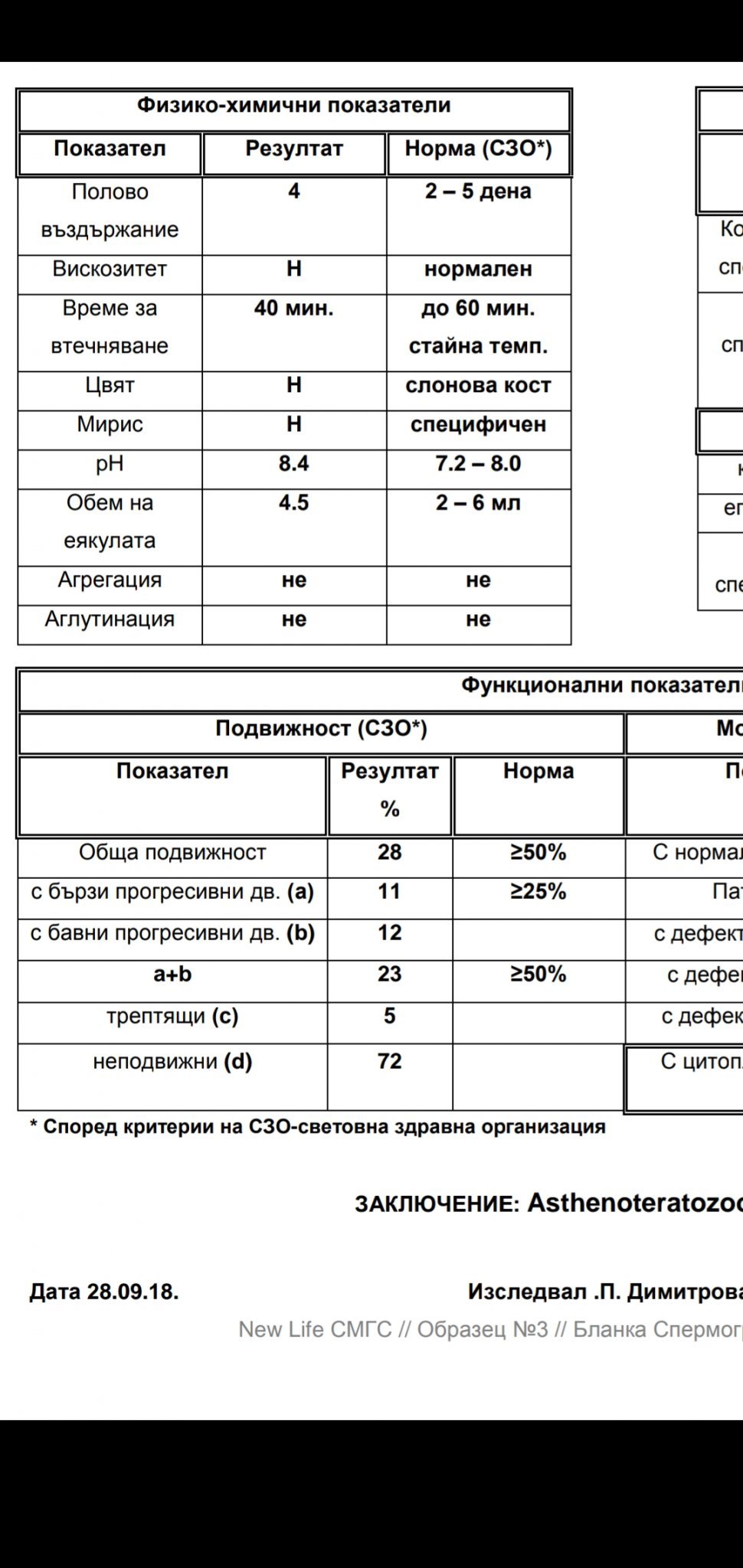 Пациентите съобщават за подобрения в резултатите от спермограмата след лечение. Например, един случай показва увеличение на общия брой сперматозоиди от 303 милиона до 458 милиона и увеличение на морфологията от 4% до 8%. Друг случай отбелязва подобрение от 8% до 42% подвижни сперматозоиди и от 2% до 4% морфология. Тези подобрения се дължат на приема на добавки и промени в начина на живот, като спиране на употребата на твърд алкохол и преминаване от обикновени цигари към iqos.