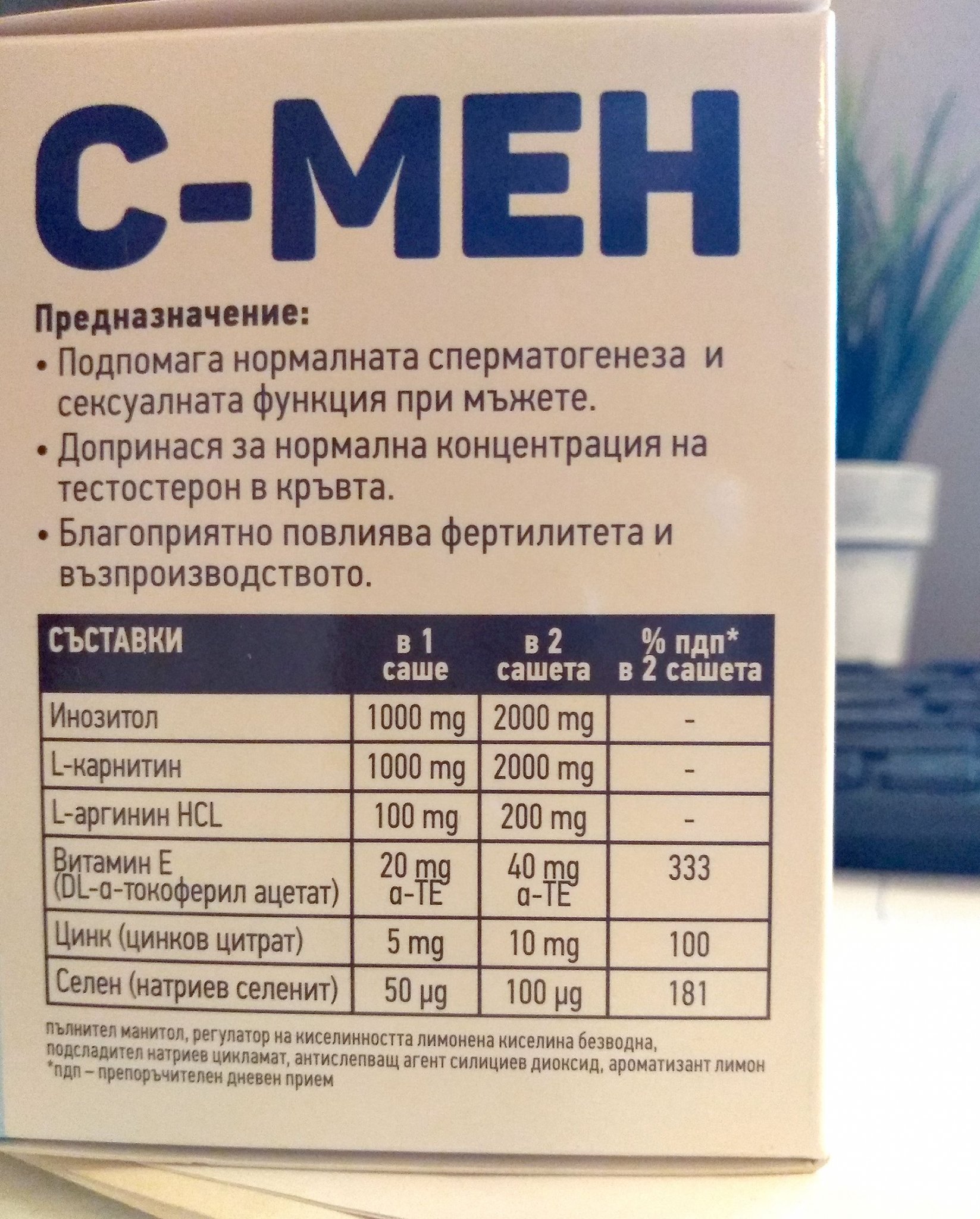 Аз мога да споделя от опит при мм-андролог и уролог предписаха Вит.Е от по 400мг. дневно. Той играе една от основните роли в сперматогенезата. По това, което виждам на съдържанието е написано при прием на 2 сашета, че е 40мг., което е 333%от ПДП. Това,може да е за хора, които не е важна морфология, обем и др.,но за да има ефект бих взела отделно тези добавки и то в по-високи дози. Това по-скоро е хр. добавка с поддържаща роля за мъжката полова система.