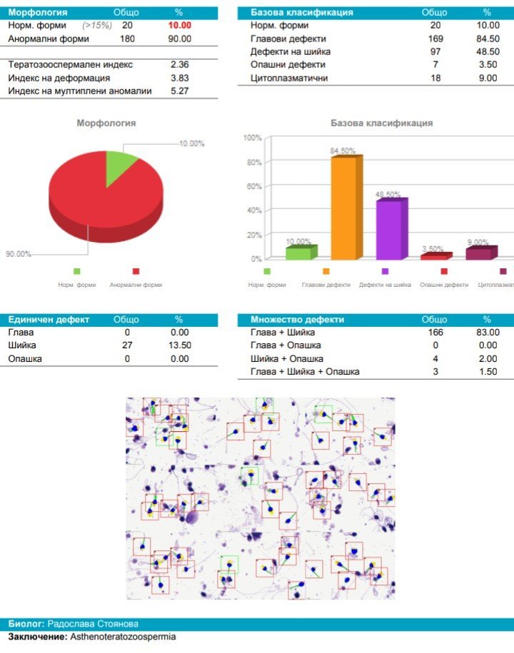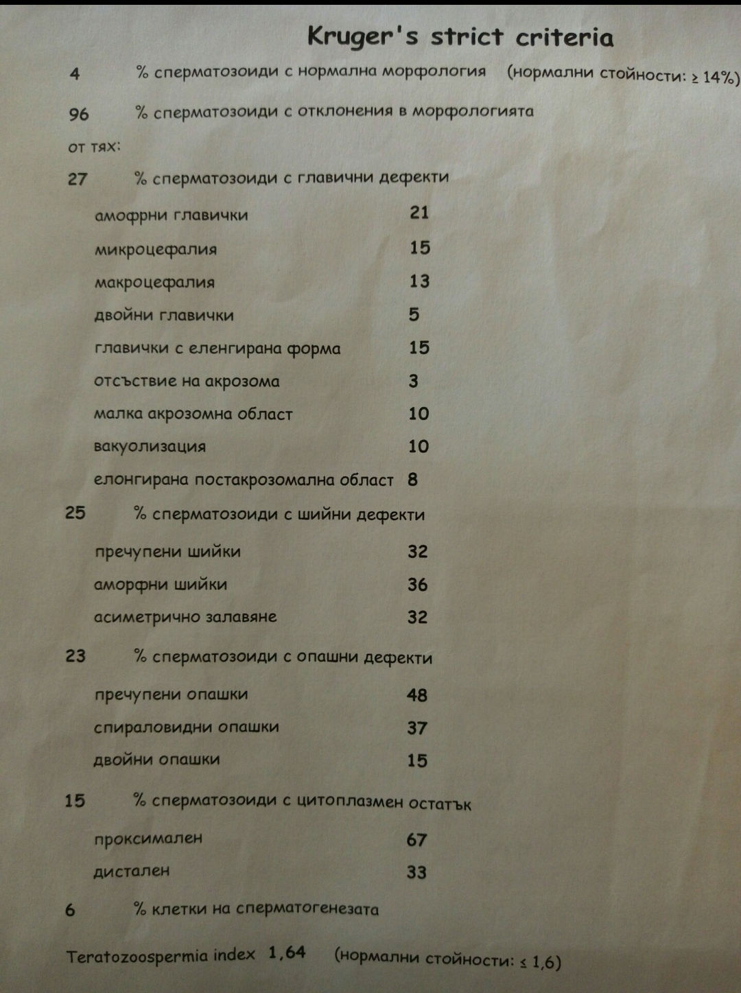 Пациентите съобщават за подобрения в резултатите от спермограмата след лечение. Например, един случай показва увеличение на общия брой сперматозоиди от 303 милиона до 458 милиона и увеличение на морфологията от 4% до 8%. Друг случай отбелязва подобрение от 8% до 42% подвижни сперматозоиди и от 2% до 4% морфология. Тези подобрения се дължат на приема на добавки и промени в начина на живот, като спиране на употребата на твърд алкохол и преминаване от обикновени цигари към iqos.