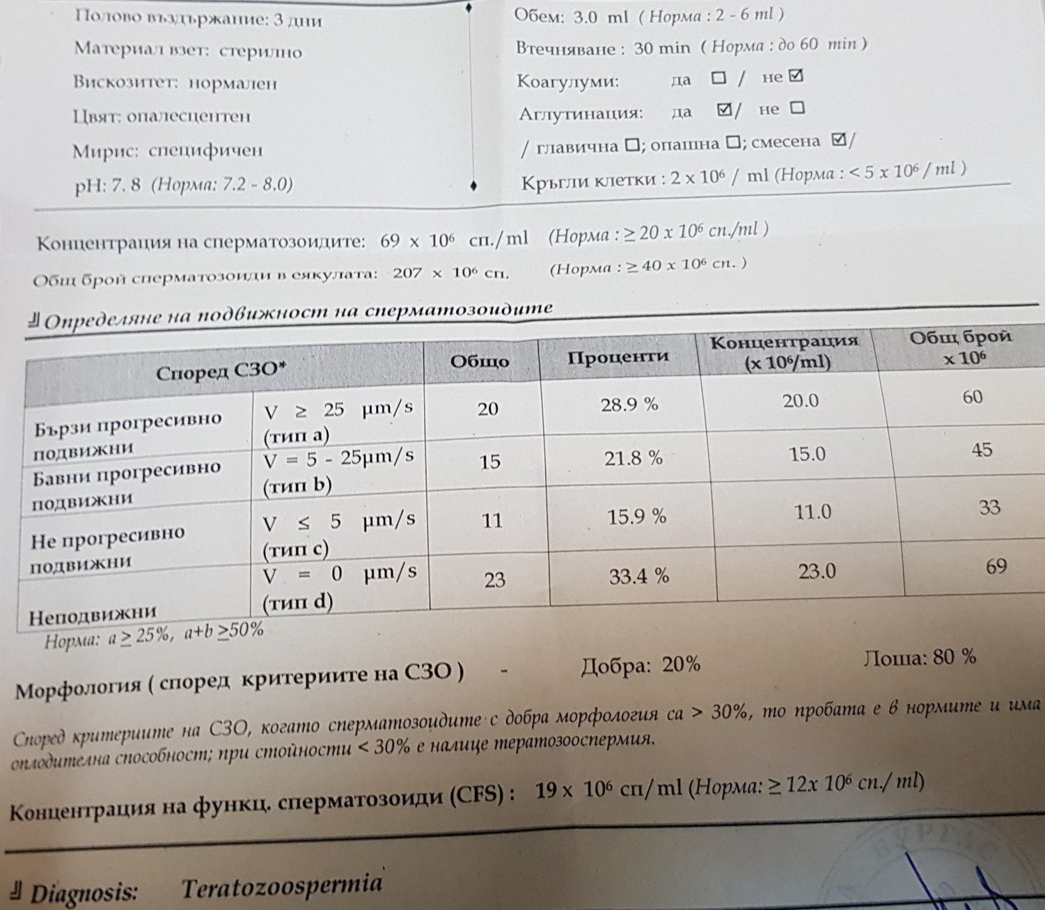 Здравейте-и аз да се включа. От известно време следя форума но поствам за първи път. С мъжа ми пробваме за бебе от една година безуспешно, като минахме преглед преди месец в Бургас-назначиха ни спермограма и ако някой може да коментира резултата, ще съм много много благодарна.