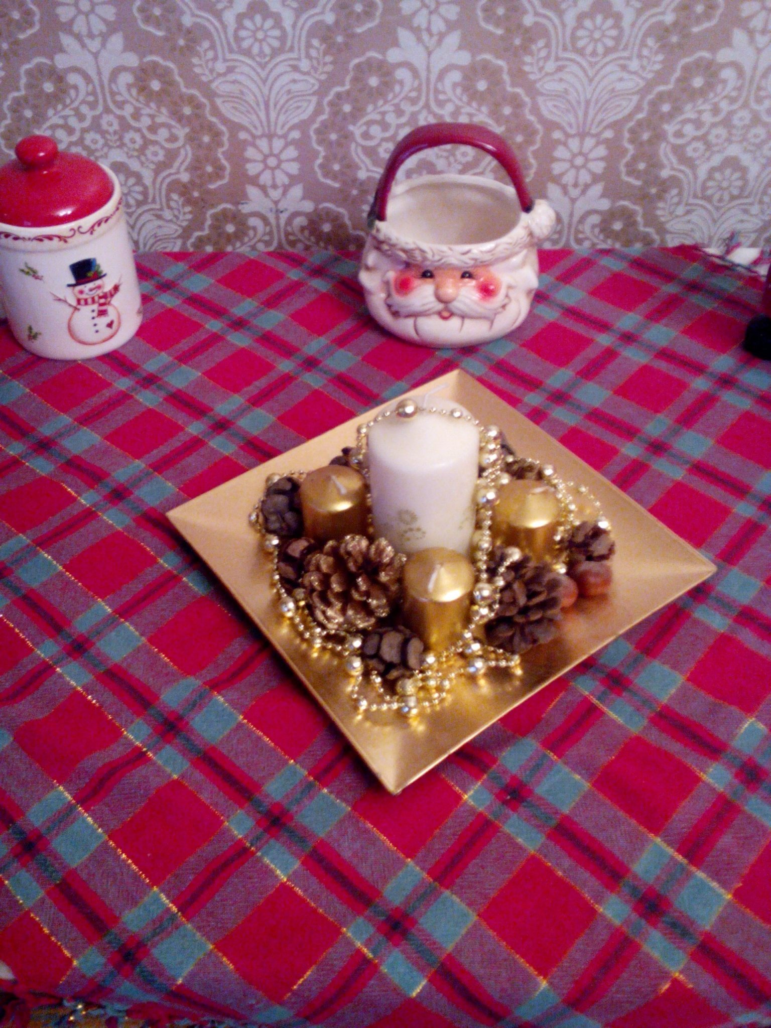 Мястото къде съм я подредила таз` композицийка не е особено фотогенично... затова съм я изнесла тук за снимка... Wink (подаръчетата и чувалчето са мое дело... а чорапчето на свещта на мамето, тя го изплате)