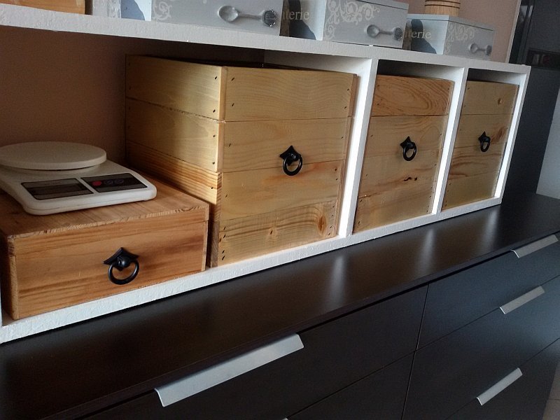 Ние взехме дървени кутии, наслагах им дръжки и стоят в една етажерка, много е удобно и събират доста.