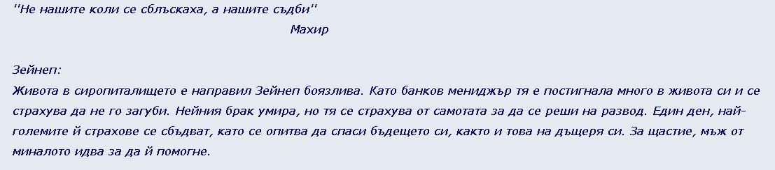 На друго място пък пишат, че Кадир и Зейнеп се познавали от сиропиталището ... а нали Кадир ще си има майка и сестра  newsm78 Ще видим на края какво все пак ще бъде. При всички случаи историята звучи интересно, дано да е такава  Praynig Но, се стряскам като чета във фейса как всички пишат, че ще е хита на сезона, да не ни урочасат нещо пу пу пу
