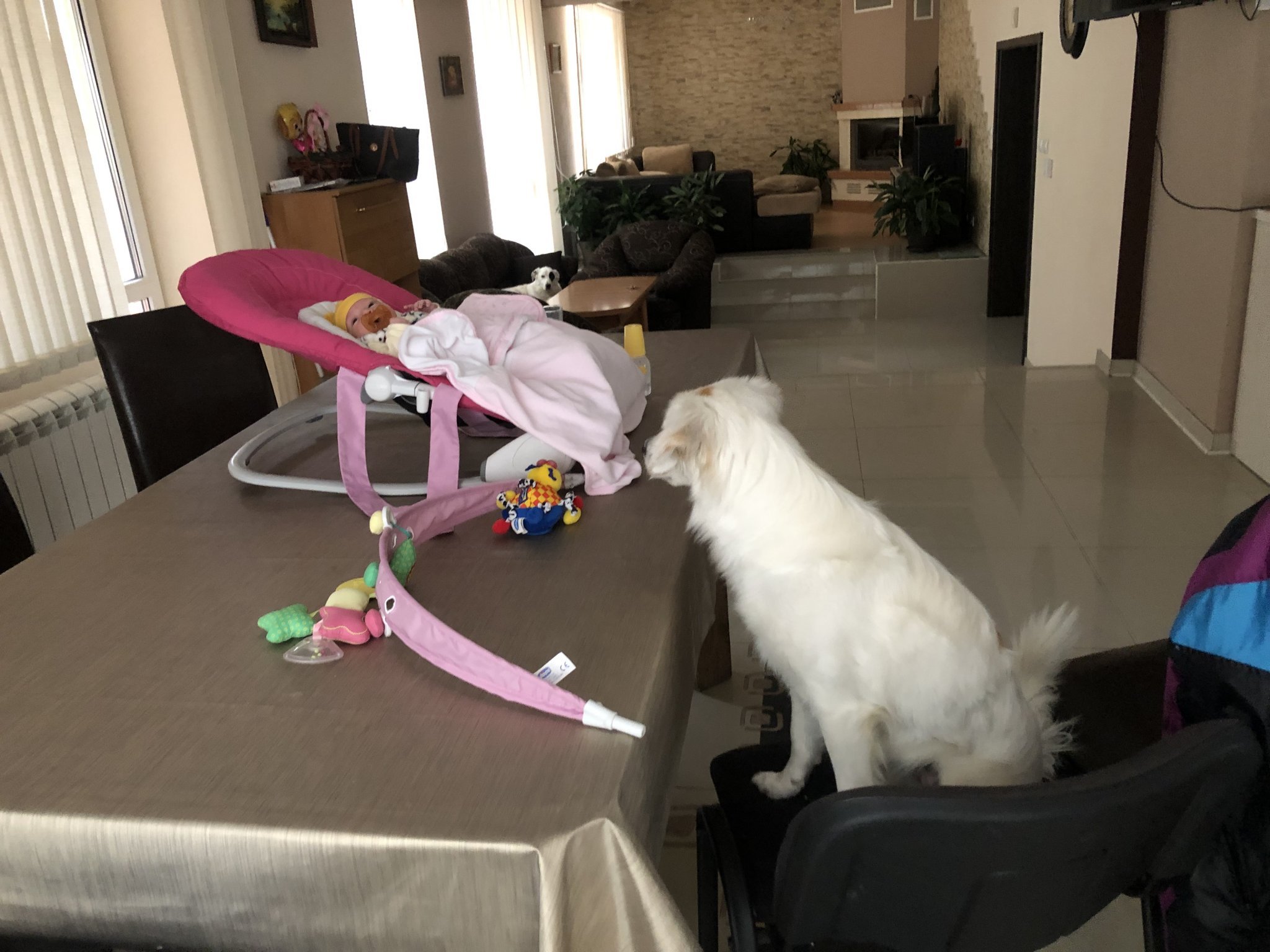 Мамите с домашните любимци кога ги запознахте с бебето? До каква степен ги допускате до него? Аз съм с две кучета, които през деня са на двора, вечер вътре на първия етаж, но те страшно много са свикнали с мен и сега бая се мъчат, че не им обръщам внимание. Вчера им беше първата по-дълга среща. Едното полудя от кеф и не се отделяше от бебка, другото не ни отрази. Ето и снимков материал Grinning