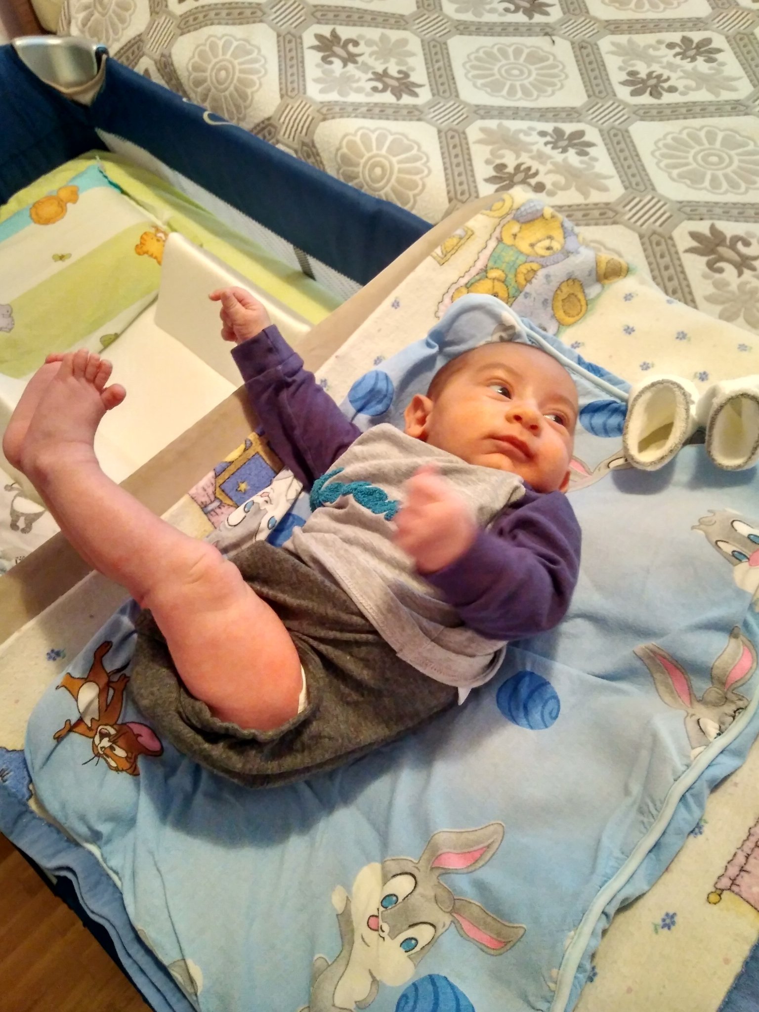 Относно спането - спи си в леглото. Преди, когато ядеше през нощта, нямах сили да го преспивам и го вЗемах при нас. Сега обаче се пробужда да си търси биберона. Горе долу успявам да го преспя Без да го вадя от леглото. Купих му гнездо и незнам дали заради него ама хубаво си спи. Почна да прави паузи между храненията около 6-7-8 часа( имам предвид от последното вечерно до сутрешното) Относно яденето - има 5 яденета на денонощие, но като количество варират. Вчера например си яде по 180 мл на хранене. Миналия ден обаче яде от 120 до 170 мл. Понеже се водя по кутията на АМ вече му правя по 200 мл, пък той колкото си изяде , никога не го насилвам ( то и да искам не мога, той така си стиска устата, че нищо не можеш да пъхнеш)