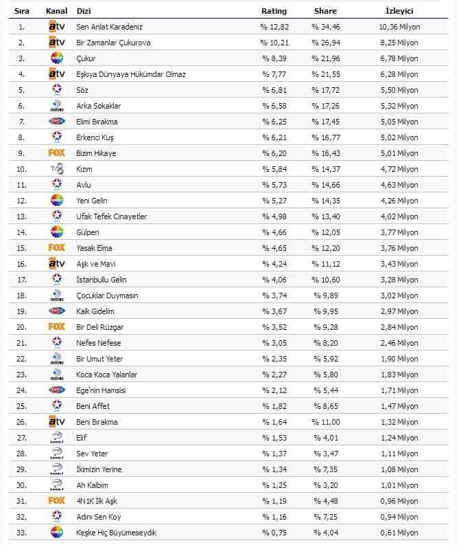 Най-гледаните не са тези в понеделник Чукура и Сьоза, Карадениз също е тръгнал надолу и май скоро ще отстъпи първото място на сериала с Вахиде Whistling НИ е много добре, да не повярва човек Mr. Green А и разликите от пето до девето място са почти незначителни Wink На Толгахан пак не му провървя, на почетното 22-ро място е Laughing