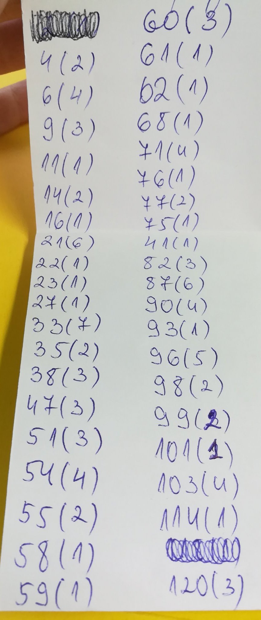 Повтарятщи се 4.15.16.19.23.27.33.38.41.51.56.57.59.60.71.73.75.76.77.80.82.85.89.90.92.93.96.97.101.108.111.120