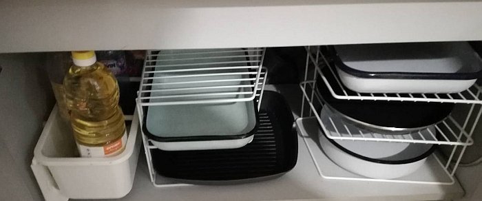 Къде си държите йените и керамичните тави? Аз все не мога да им намеря място, скоро счупих една керамична поради липса на място, сложих я върху едни други.