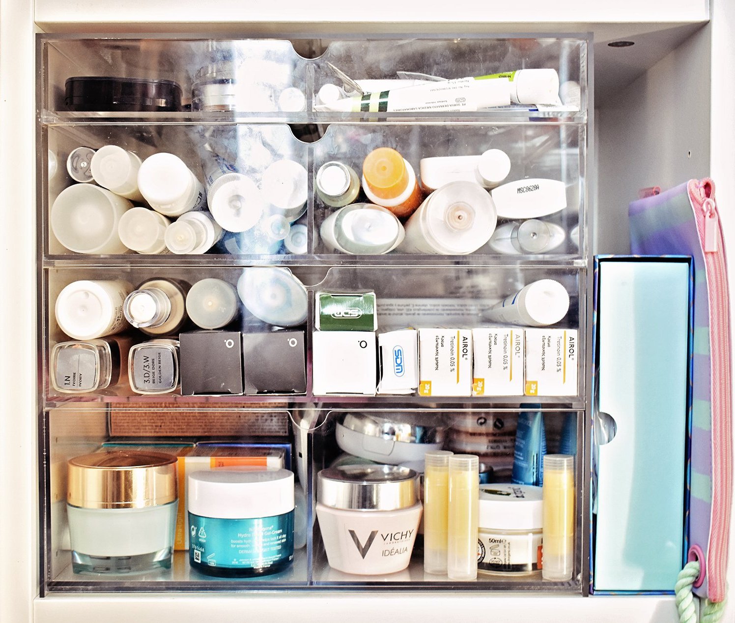 1. Как да организирам козметиката си? Не е в промишлени количества, но е доста. В банята няма място, нито пък изобщо вкъщи за цяла тоалетка. Къде я държите? В чекмеджета на скрин може, но пък не искам всичко да изсипя, а някак да е по-подредено и прегледно.
