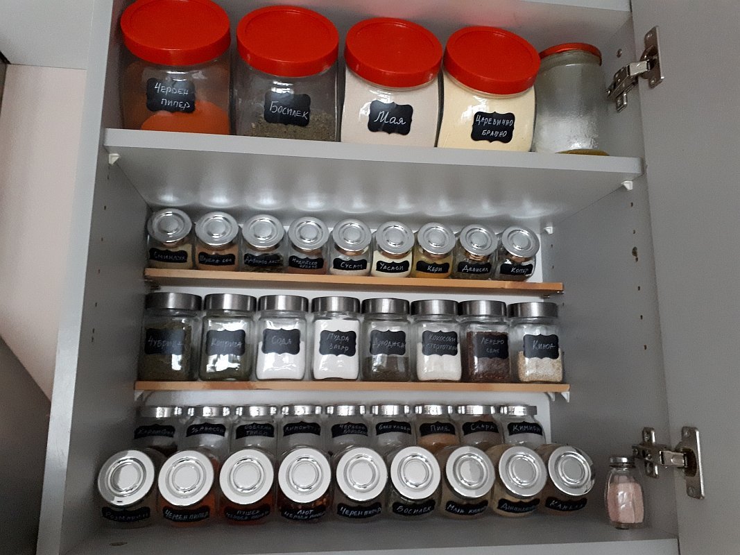 Не се сърди, човече, страхотно изглежда! Това е малко шкафче само за подправки или си обособила част от по-голям шкаф? Не мога да преценя от снимката.