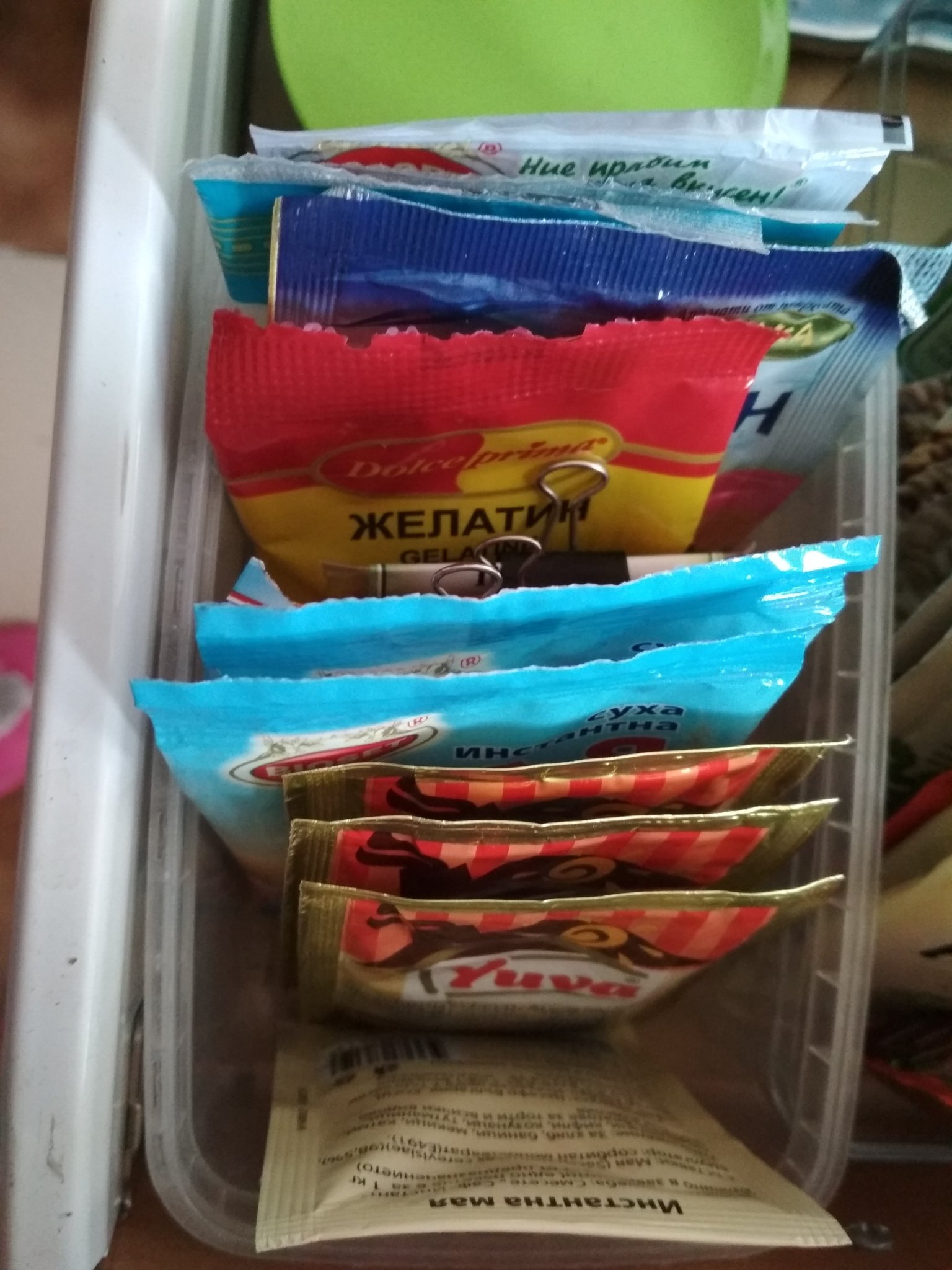 Сладките почти всички ги махнах. Не правя сладкиши и сладки неща и никога не съм. Не знам защо имах есенцийки и глупости. Опитвам се да се отърва от настройката "ами, ако ми потрябва?!". Ако ми потрябва веснъж в годината, ще изтичам до магазина, който е на 3 минути и ще купя.