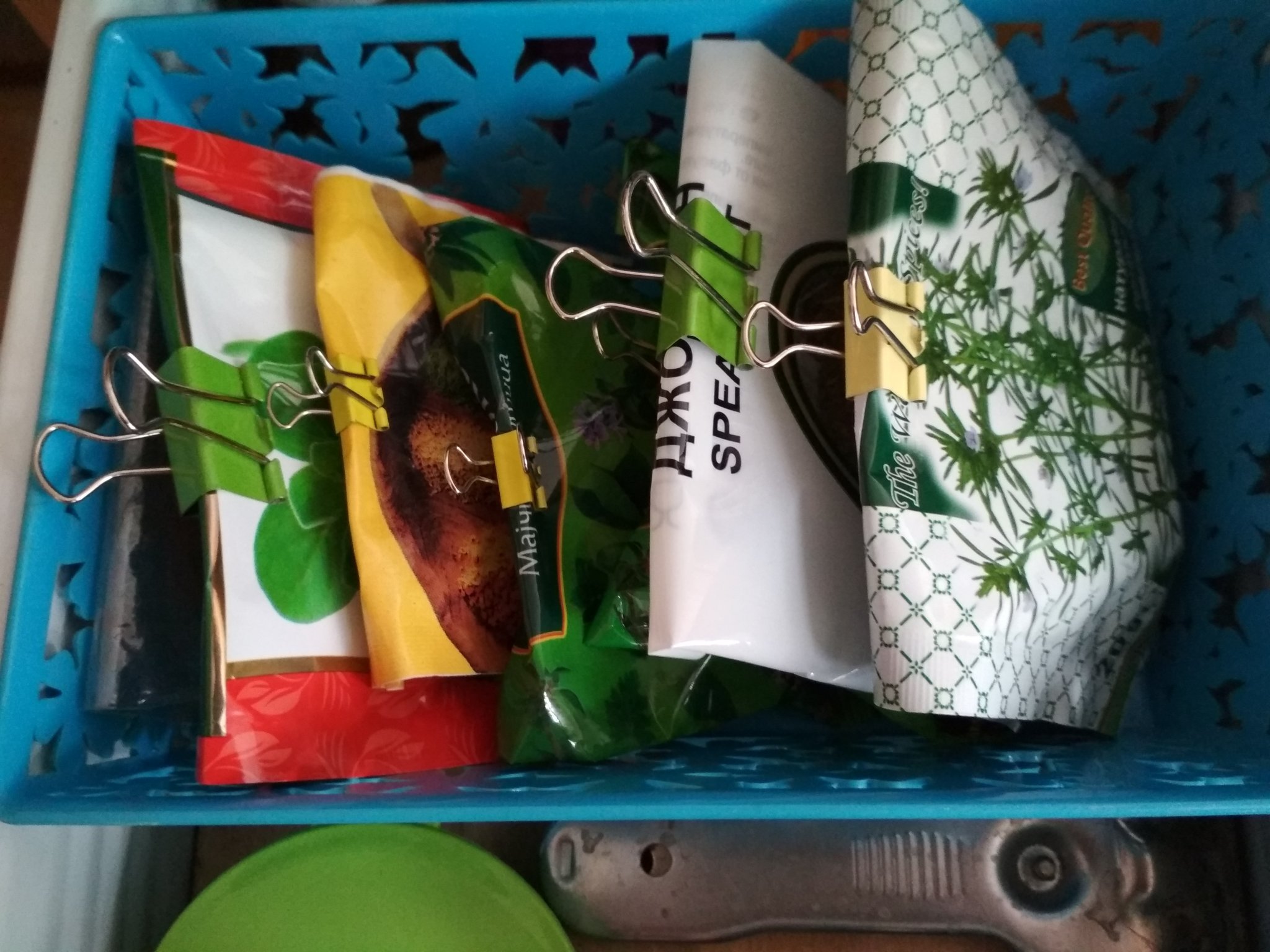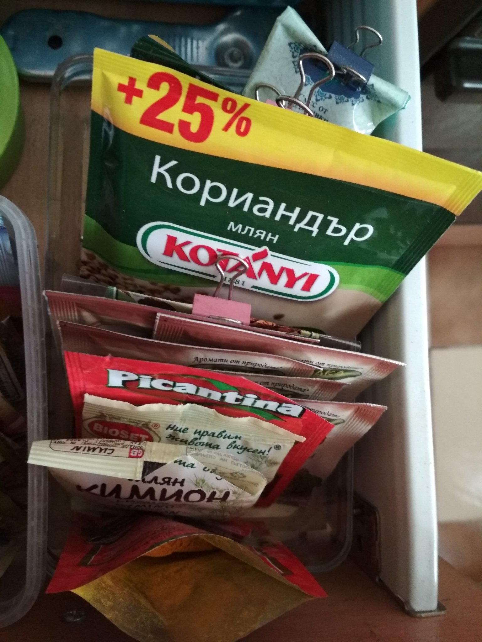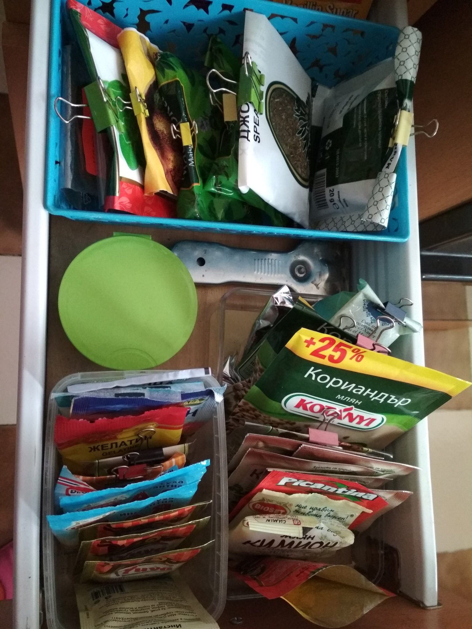 Подправките тук са в шишенца, много е удобно( купувам предимно стъклени, но има и пластмасови). Намират ми се и пакетчета, но са прибрани в кутия в шкаф.