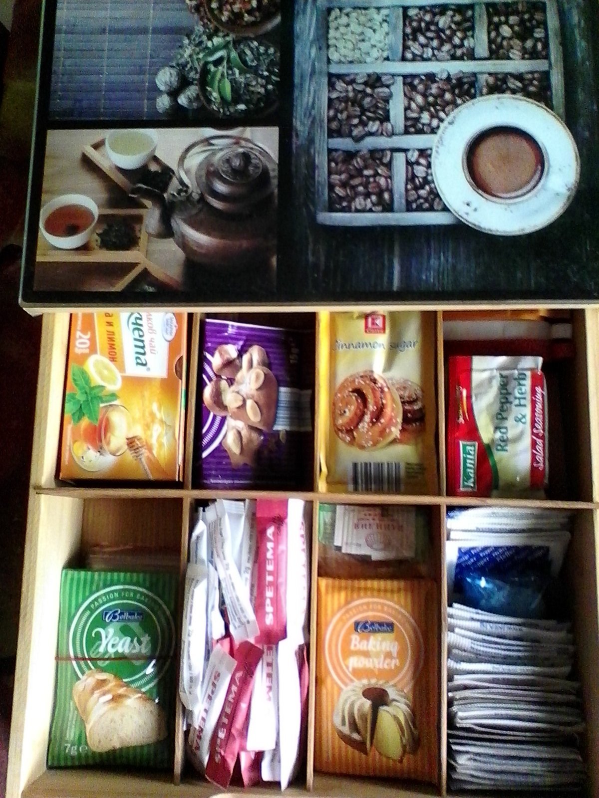 Редуцирах подправките до 15-6 (съответно в бурканчета) + 5-6 по- редки в пакетчета в една малка кутия за чай с 2 отделения.