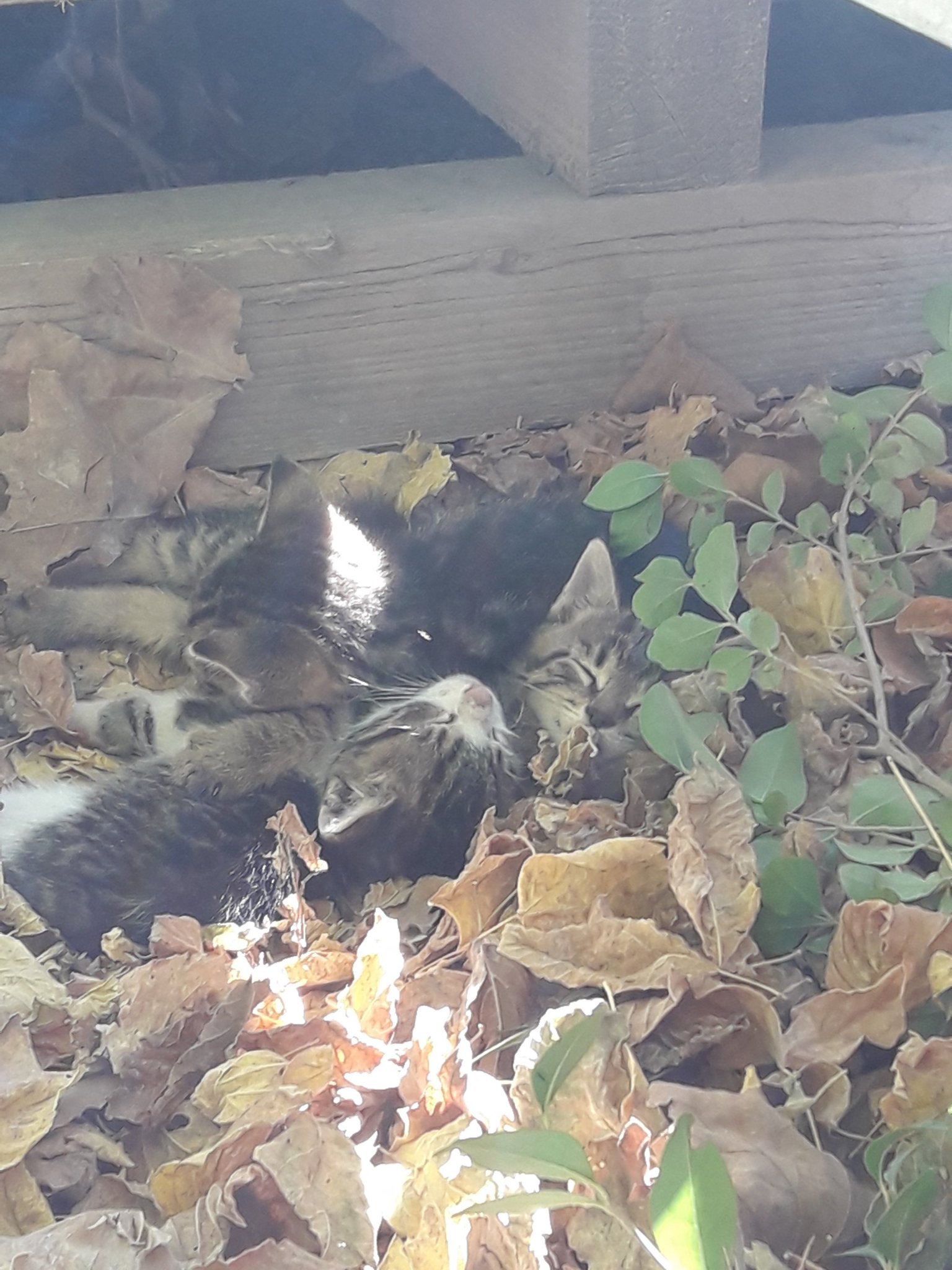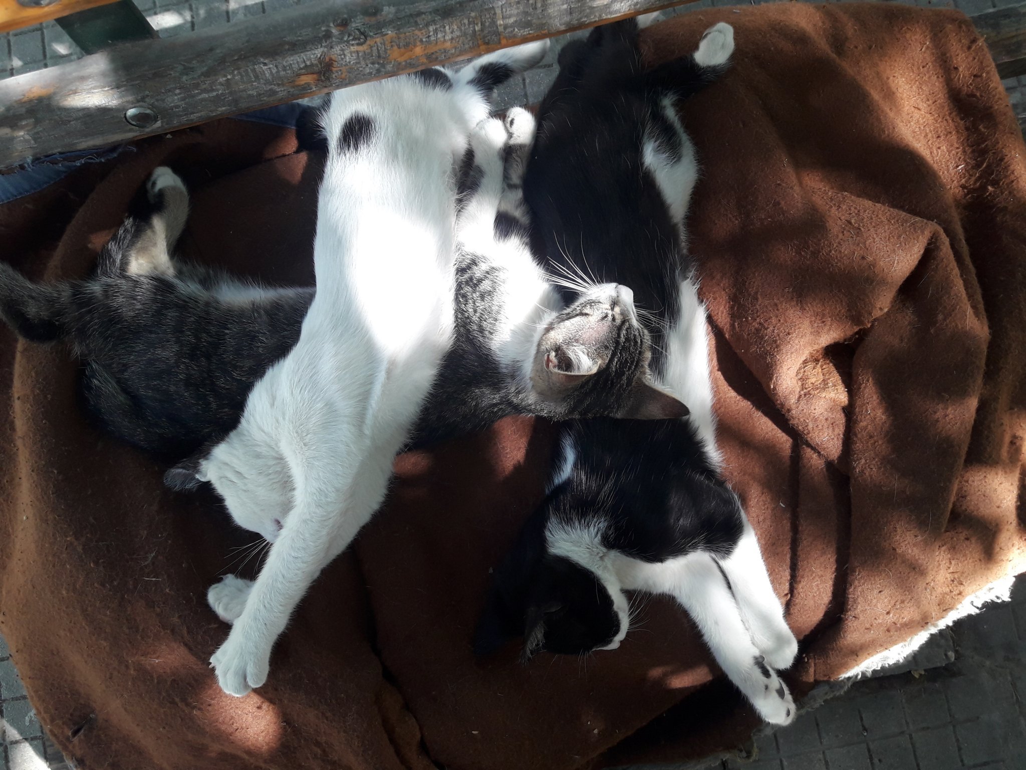 Днес отивам на вилата и какво да видя. Моята писана си довела малките в къщата. Толкова са пораснали и палави. Бях им взела храничка и така сладко я хапнаха. Обаче напролет ще водя мама за кастрация. Тя се появи със закъснение при тях, дадох й пауч и тя им го занесе да го хапнат. А после калпазаните сукаха. Коремчетата им ще се пръснат. Две мъжки и едно женско, две от тях са чисто черни марочета. Ще ги дебна за снимки.