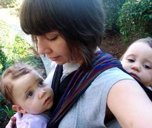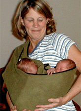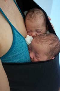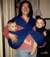 Преди около месец попаднах една статия за носене на близнаци в слинг http://omama.ru/docs/tpl/doc.asp?id=259&. Има страшно умилителни снимки. Виж цялата статия дори и да не четеш руски. Има линк към видеоматериал за носене на близнаци, както и към снимките има линкове към инструкции как точно се поставя слинга в съответната поза. Тук привеждам само снимките:
