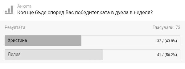 Много се радвам! Лилито ги разби. Очаквам Хриса да избере Ивайло за фермер, а от продукцията не знам. Искам Лили фермер, интересно ще е. И е време за мъжки дуел следващата седмица.