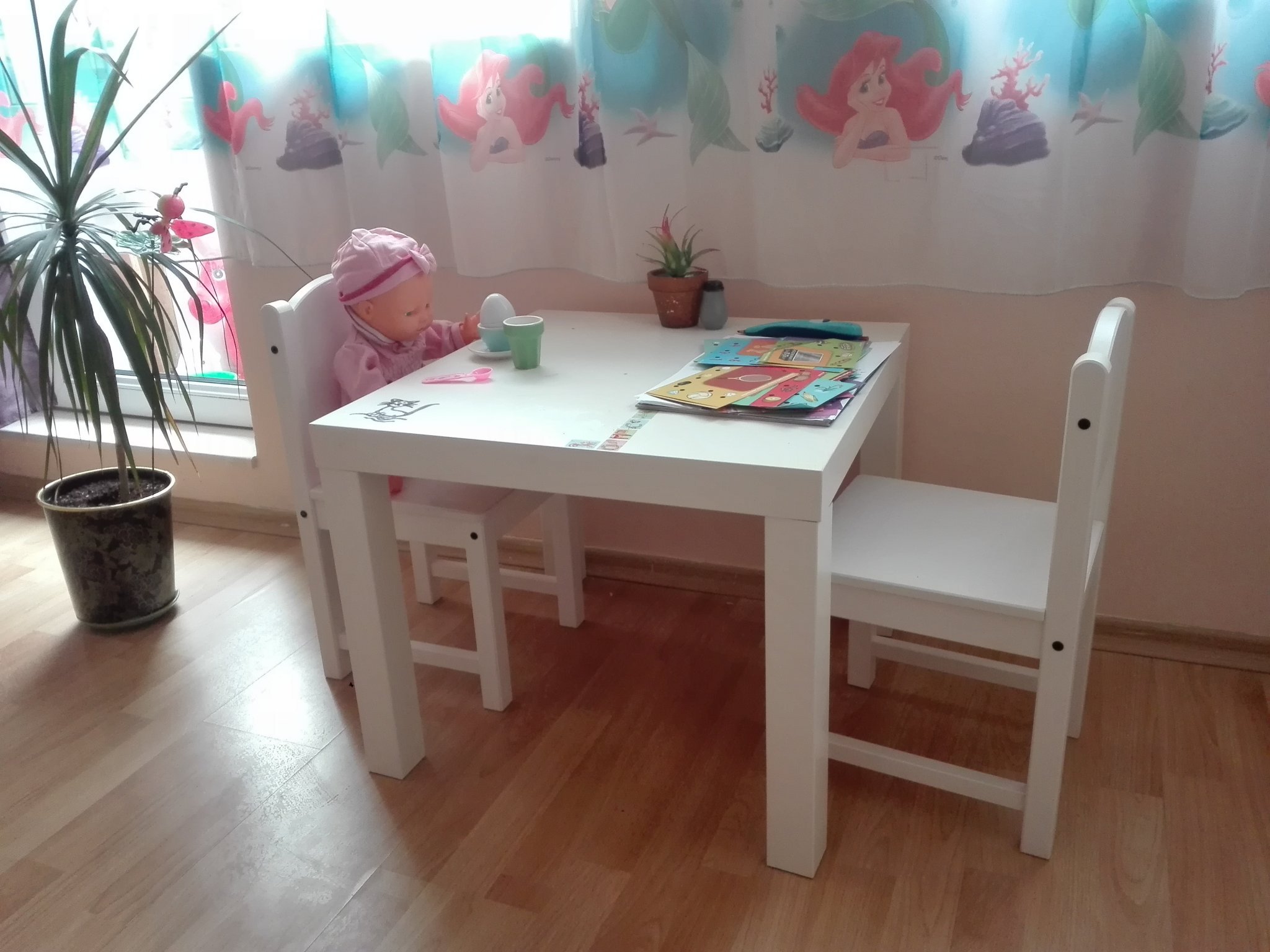 Столчетата купих детските, но масата от комплекта ми се  видя скъпа. За това купих... помощна холска масичка май се водеше, пак от Икеа,но беше 10 лв Simple Smile Не си личи,че не са комплект...