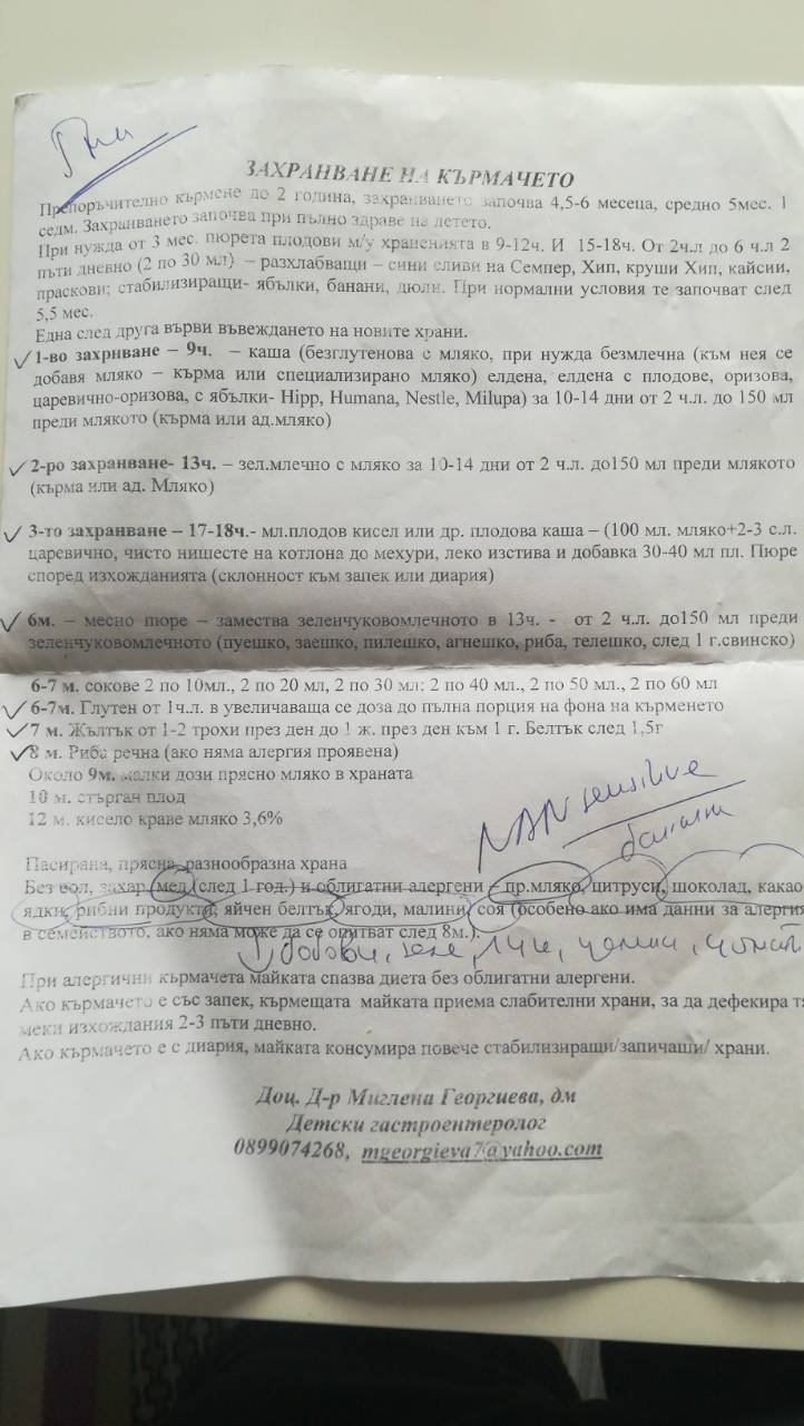 Чакайте да си споделя. Бяхме на нефролог, и там всичко ток и жица, само бъбреците са ни по големи. По скоро бъбреците са с нормални размери, а тялото ни е малко. Ама няма проблем. Бяхме и на гастро, уж за млякото, остава това с което аз реших да я храня(много му разбирам вече хахаха). Питах за захранване, изстреля ми една схема на бързо, нищо не запомних, ама да съм я хранила с пюрета на Гербер. Е аз твърдо съм решила сама да си правя пюретата, дано ги яде принцесата. Аз щях и да кърмя, ама сега сменям АМ. Каквото детето покаже, ако не ми иска пюретата, ще купувам. Ходих иначе да ги разгледам, има интересни комбинации, и цените са им интересни. За мен си е голяма скъпотия 3 лв пюре. Да е жив и здрав тати да изкарва, а мама да харчи:grinning: