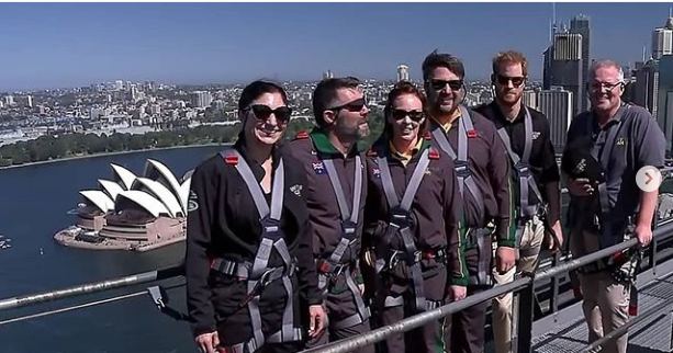 Хари на върха на пристанищния мост в Сидни заедно с австралийския премиер и други посланици